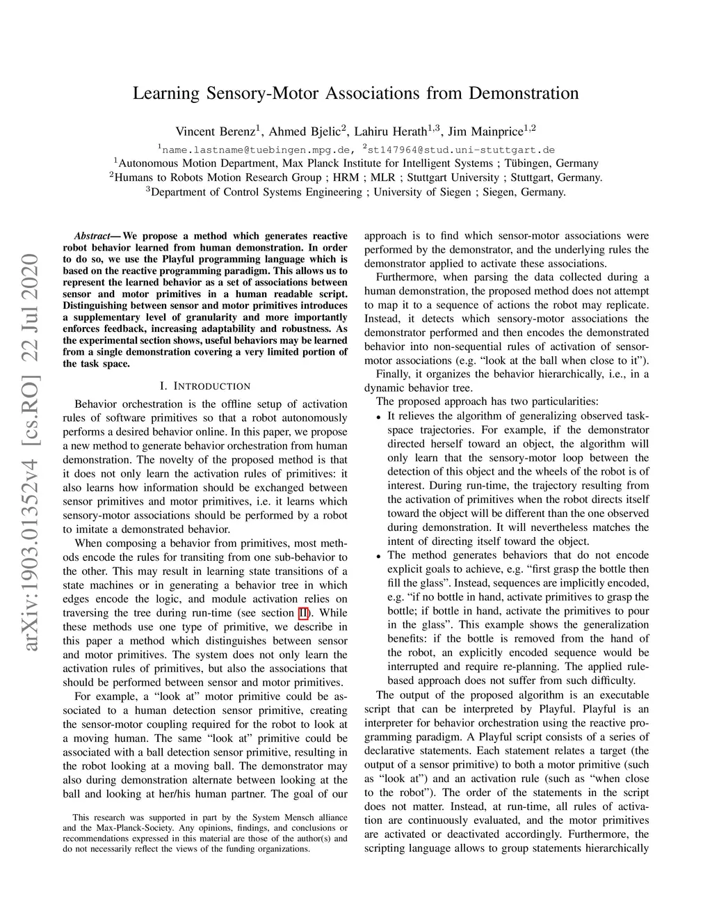Learning Sensory-Motor Associations from Demonstration