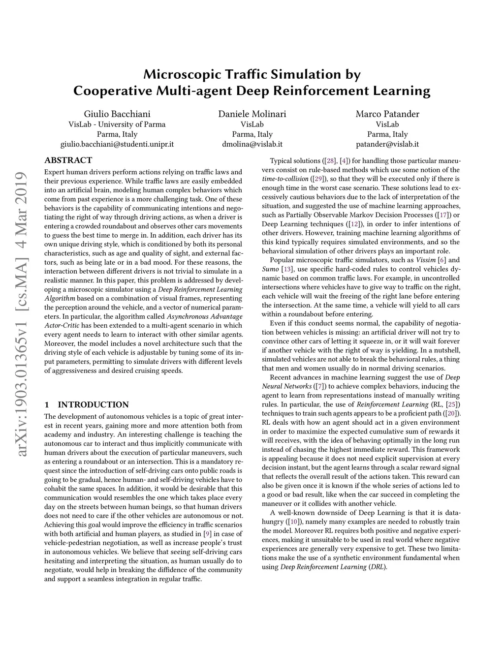 Expert human drivers perform actions relying on traffic laws and their previous experience. While traffic laws are easily embedded into an artificial brain, modeling human complex behaviors which come from past experience is a more challenging task. One of these behaviors is the capability of communicating intentions and negotiating the right of way through driving actions, as when a driver is entering a crowded roundabout and observes other cars movements to guess the best time to merge in. In addition, each driver has its own unique driving style, which is conditioned by both its personal characteristics, such as age and quality of sight, and external factors, such as being late or in a bad mood. For these reasons, the interaction between different drivers is not trivial to simulate in a realistic manner. In this paper, this problem is addressed by developing a microscopic simulator using a Deep Reinforcement Learning Algorithm based on a combination of visual frames, representing the perception around the vehicle, and a vector of numerical parameters. In particular, the algorithm called Asynchronous Advantage Actor-Critic has been extended to a multi-agent scenario in which every agent needs to learn to interact with other similar agents. Moreover, the model includes a novel architecture such that the driving style of each vehicle is adjustable by tuning some of its input parameters, permitting to simulate drivers with different levels of aggressiveness and desired cruising speeds.