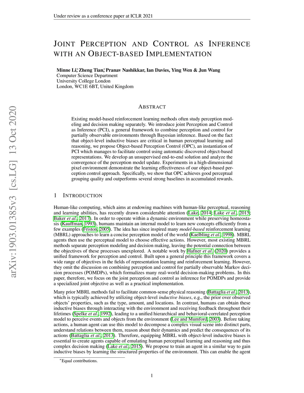 Existing model-based reinforcement learning methods often study perception modeling and decision making separately. We introduce joint Perception and Control as Inference (PCI), a general framework to combine perception and control for partially observable environments through Bayesian inference. Based on the fact that object-level inductive biases are critical in human perceptual learning and reasoning, we propose Object-based Perception Control (OPC), an instantiation of PCI which manages to facilitate control using automatic discovered object-based representations. We develop an unsupervised end-to-end solution and analyze the convergence of the perception model update. Experiments in a high-dimensional pixel environment demonstrate the learning effectiveness of our object-based perception control approach. Specifically, we show that OPC achieves good perceptual grouping quality and outperforms several strong baselines in accumulated rewards.