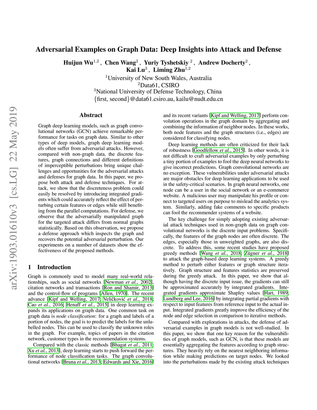 Graph deep learning models, such as graph convolutional networks (GCN) achieve remarkable performance for tasks on graph data. Similar to other types of deep models, graph deep learning models often suffer from adversarial attacks. However, compared with non-graph data, the discrete features, graph connections and different definitions of imperceptible perturbations bring unique challenges and opportunities for the adversarial attacks and defenses for graph data. In this paper, we propose both attack and defense techniques. For attack, we show that the discreteness problem could easily be resolved by introducing integrated gradients which could accurately reflect the effect of perturbing certain features or edges while still benefiting from the parallel computations. For defense, we observe that the adversarially manipulated graph for the targeted attack differs from normal graphs statistically. Based on this observation, we propose a defense approach which inspects the graph and recovers the potential adversarial perturbations. Our experiments on a number of datasets show the effectiveness of the proposed methods.