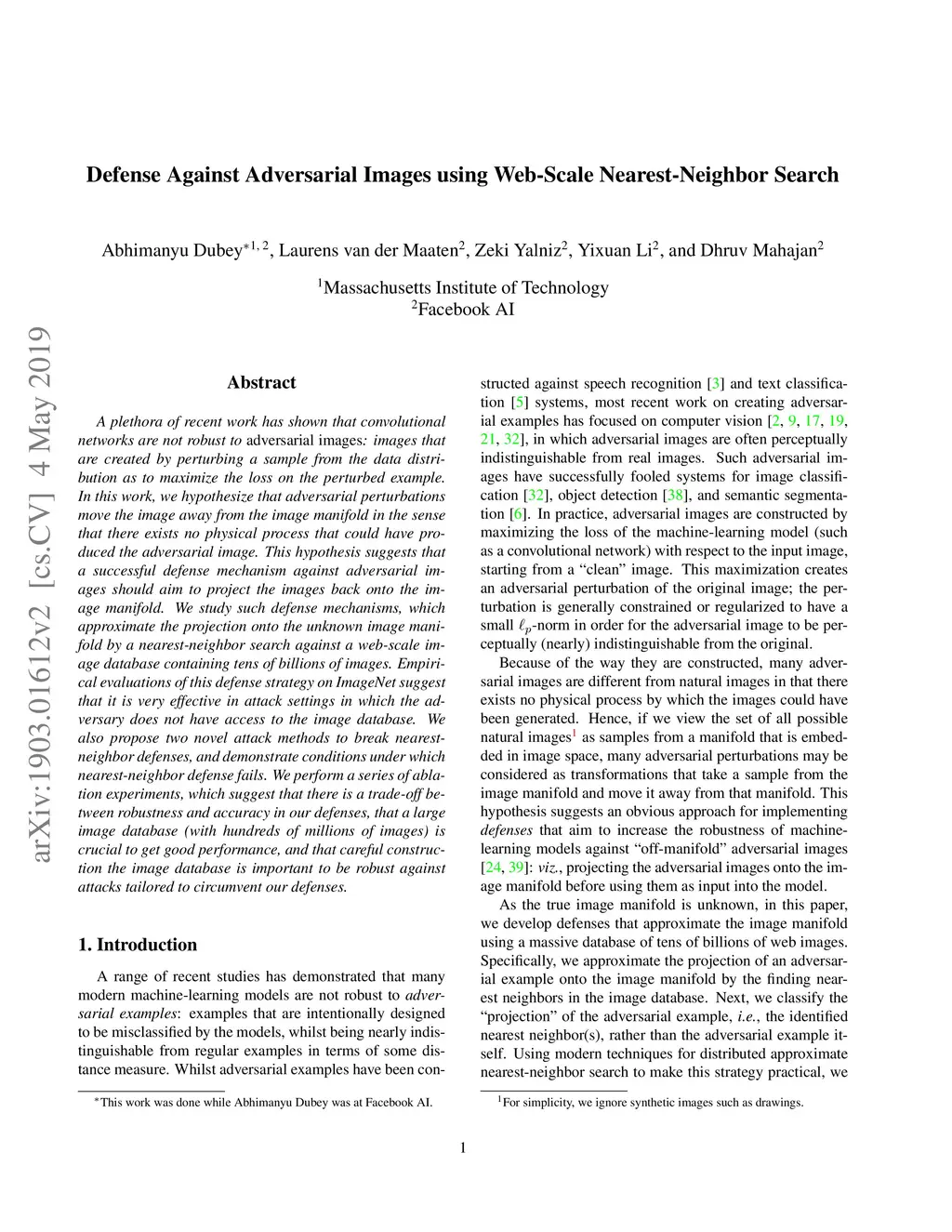 A plethora of recent work has shown that convolutional networks are not robust to adversarial images: images that are created by perturbing a sample from the data distribution as to maximize the loss on the perturbed example. In this work, we hypothesize that adversarial perturbations move the image away from the image manifold in the sense that there exists no physical process that could have produced the adversarial image. This hypothesis suggests that a successful defense mechanism against adversarial images should aim to project the images back onto the image manifold. We study such defense mechanisms, which approximate the projection onto the unknown image manifold by a nearest-neighbor search against a web-scale image database containing tens of billions of images. Empirical evaluations of this defense strategy on ImageNet suggest that it is very effective in attack settings in which the adversary does not have access to the image database. We also propose two novel attack methods to break nearest-neighbor defenses, and demonstrate conditions under which nearest-neighbor defense fails. We perform a series of ablation experiments, which suggest that there is a trade-off between robustness and accuracy in our defenses, that a large image database (with hundreds of millions of images) is crucial to get good performance, and that careful construction the image database is important to be robust against attacks tailored to circumvent our defenses.