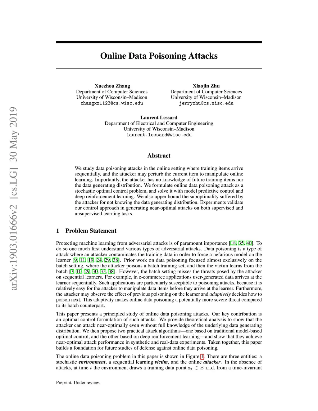 We study data poisoning attacks in the online setting where training items arrive sequentially, and the attacker may perturb the current item to manipulate online learning. Importantly, the attacker has no knowledge of future training items nor the data generating distribution. We formulate online data poisoning attack as a stochastic optimal control problem, and solve it with model predictive control and deep reinforcement learning. We also upper bound the suboptimality suffered by the attacker for not knowing the data generating distribution. Experiments validate our control approach in generating near-optimal attacks on both supervised and unsupervised learning tasks.