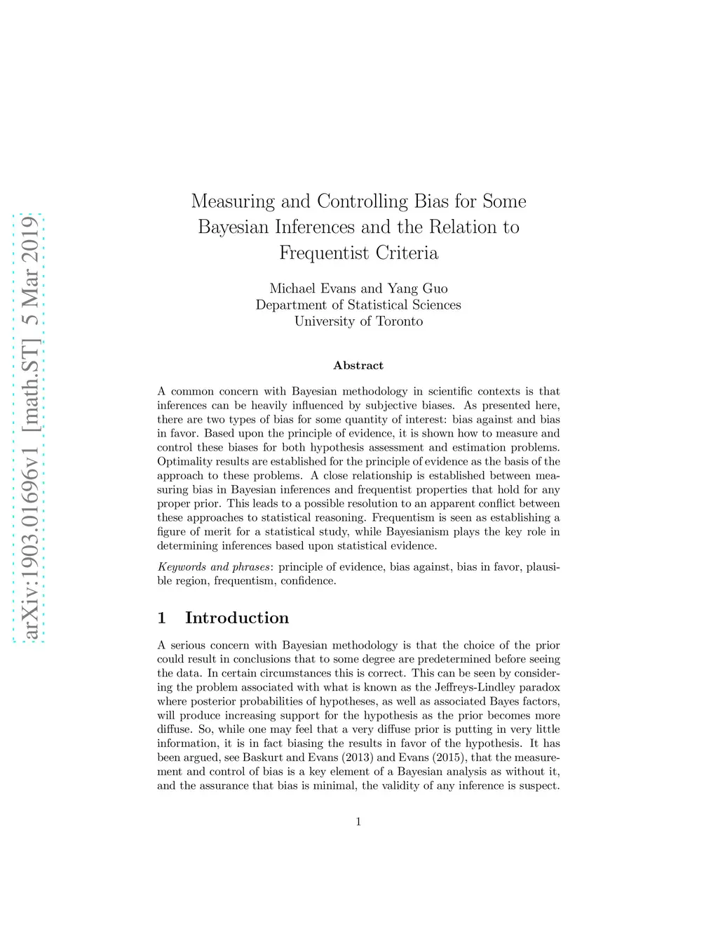 A common concern with Bayesian methodology in scientific contexts is that inferences can be heavily influenced by subjective biases. As presented here, there are two types of bias for some quantity of interest: bias against and bias in favor. Based upon the principle of evidence, it is shown how to measure and control these biases for both hypothesis assessment and estimation problems. Optimality results are established for the principle of evidence as the basis of the approach to these problems. A close relationship is established between measuring bias in Bayesian inferences and frequentist properties that hold for any proper prior. This leads to a possible resolution to an apparent conflict between these approaches to statistical reasoning. Frequentism is seen as establishing a figure of merit for a statistical study, while Bayesianism plays the key role in determining inferences based upon statistical evidence.
