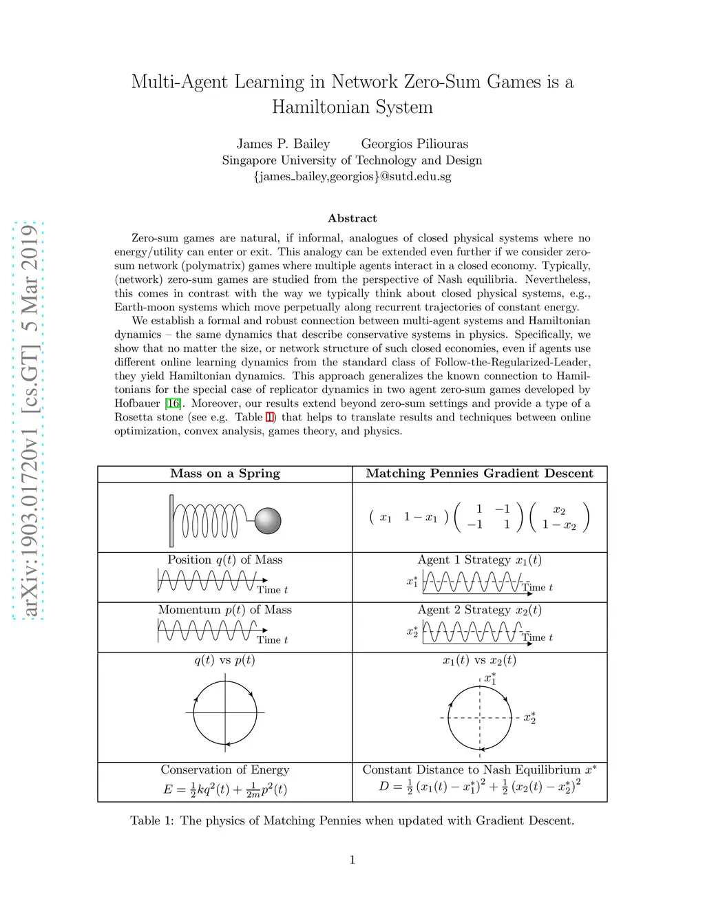 Zero-sum games are natural, if informal, analogues of closed physical systems where no energy/utility can enter or exit. This analogy can be extended even further if we consider zero-sum network (polymatrix) games where multiple agents interact in a closed economy. Typically, (network) zero-sum games are studied from the perspective of Nash equilibria. Nevertheless, this comes in contrast with the way we typically think about closed physical systems, e.g., Earth-moon systems which move perpetually along recurrent trajectories of constant energy. We establish a formal and robust connection between multi-agent systems and Hamiltonian dynamics -- the same dynamics that describe conservative systems in physics. Specifically, we show that no matter the size, or network structure of such closed economies, even if agents use different online learning dynamics from the standard class of Follow-the-Regularized-Leader, they yield Hamiltonian dynamics. This approach generalizes the known connection to Hamiltonians for the special case of replicator dynamics in two agent zero-sum games developed by Hofbauer. Moreover, our results extend beyond zero-sum settings and provide a type of a Rosetta stone (see e.g. Table 1) that helps to translate results and techniques between online optimization, convex analysis, games theory, and physics.