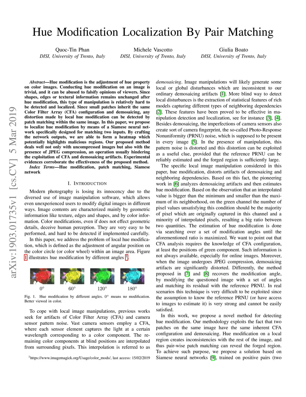 Hue modification is the adjustment of hue property on color images. Conducting hue modification on an image is trivial, and it can be abused to falsify opinions of viewers. Since shapes, edges or textural information remains unchanged after hue modification, this type of manipulation is relatively hard to be detected and localized. Since small patches inherit the same Color Filter Array (CFA) configuration and demosaicing, any distortion made by local hue modification can be detected by patch matching within the same image. In this paper, we propose to localize hue modification by means of a Siamese neural network specifically designed for matching two inputs. By crafting the network outputs, we are able to form a heatmap which potentially highlights malicious regions. Our proposed method deals well not only with uncompressed images but also with the presence of JPEG compression, an operation usually hindering the exploitation of CFA and demosaicing artifacts. Experimental evidences corroborate the effectiveness of the proposed method.