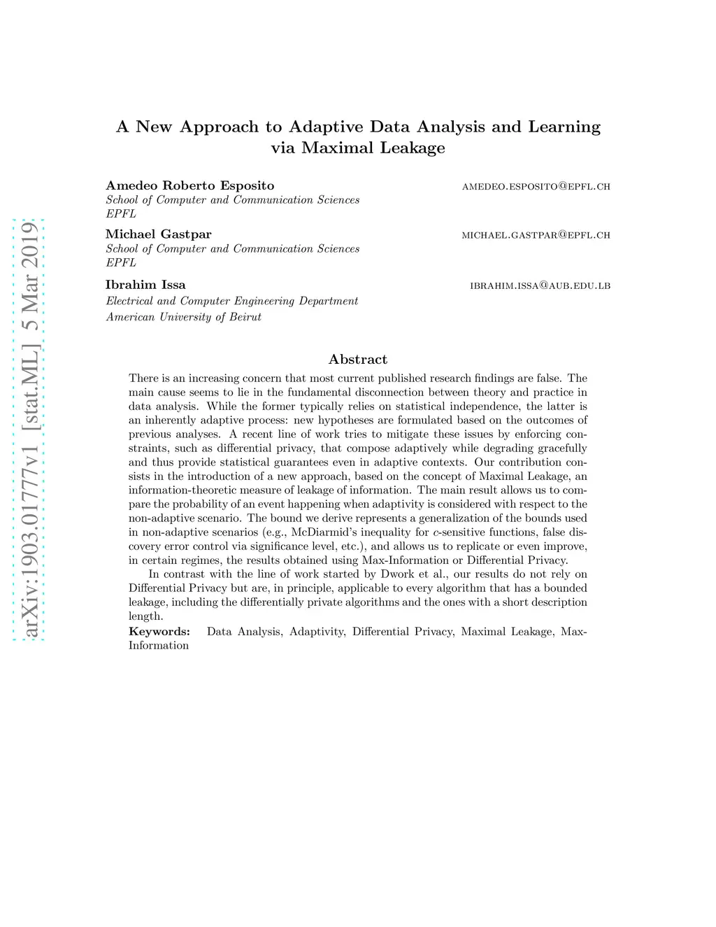There is an increasing concern that most current published research findings are false. The main cause seems to lie in the fundamental disconnection between theory and practice in data analysis. While the former typically relies on statistical independence, the latter is an inherently adaptive process: new hypotheses are formulated based on the outcomes of previous analyses. A recent line of work tries to mitigate these issues by enforcing constraints, such as differential privacy, that compose adaptively while degrading gracefully and thus provide statistical guarantees even in adaptive contexts. Our contribution consists in the introduction of a new approach, based on the concept of Maximal Leakage, an information-theoretic measure of leakage of information. The main result allows us to compare the probability of an event happening when adaptivity is considered with respect to the non-adaptive scenario. The bound we derive represents a generalization of the bounds used in non-adaptive scenarios (e.g., McDiarmid's inequality for -sensitive functions, false discovery error control via significance level, etc.), and allows us to replicate or even improve, in certain regimes, the results obtained using Max-Information or Differential Privacy. In contrast with the line of work started by Dwork et al., our results do not rely on Differential Privacy but are, in principle, applicable to every algorithm that has a bounded leakage, including the differentially private algorithms and the ones with a short description length.