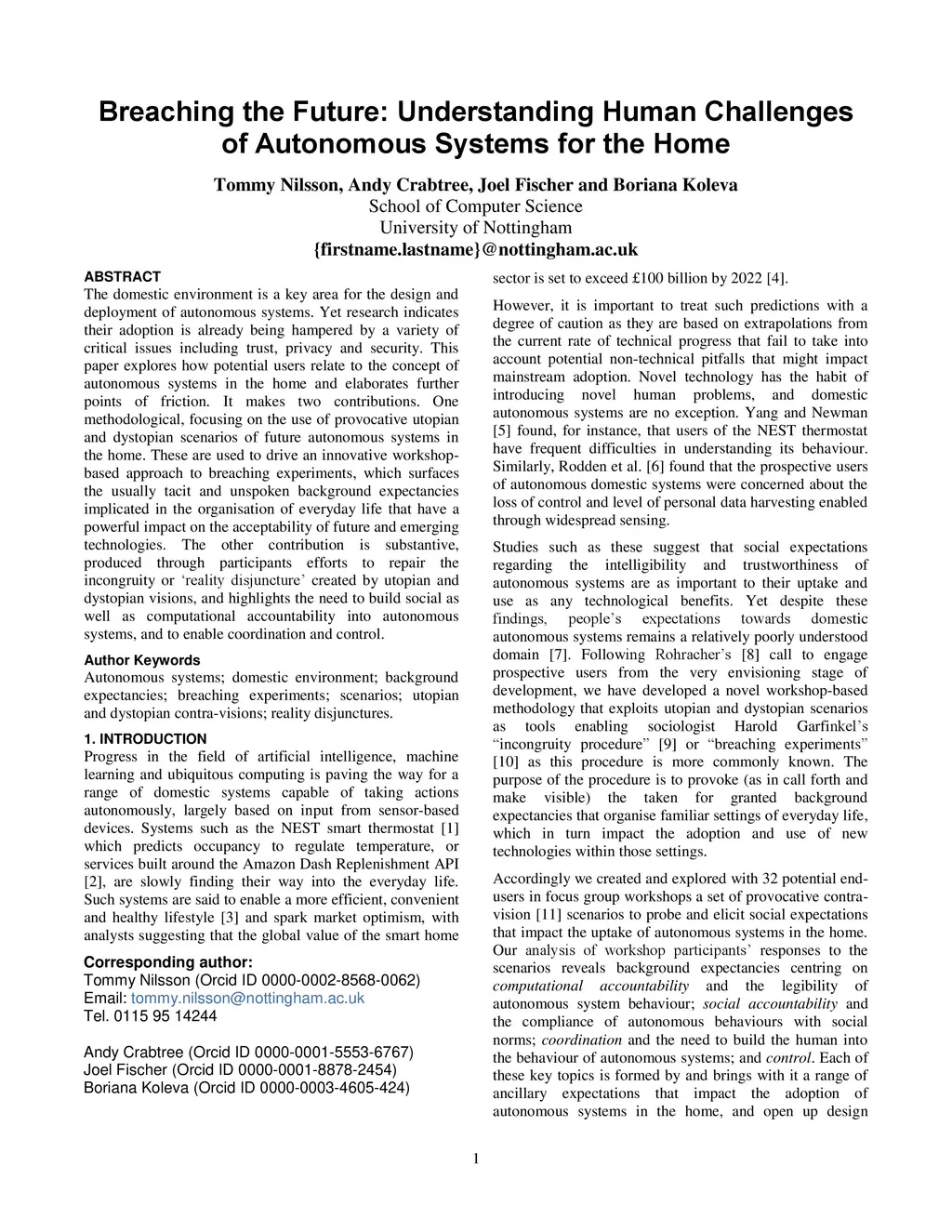 The domestic environment is a key area for the design and deployment of autonomous systems. Yet research indicates their adoption is already being hampered by a variety of critical issues including trust, privacy and security. This paper explores how potential users relate to the concept of autonomous systems in the home and elaborates further points of friction. It makes two contributions. One methodological, focusing on the use of provocative utopian and dystopian scenarios of future autonomous systems in the home. These are used to drive an innovative workshop-based approach to breaching experiments, which surfaces the usually tacit and unspoken background expectancies implicated in the organisation of everyday life that have a powerful impact on the acceptability of future and emerging technologies. The other contribution is substantive, produced through participants efforts to repair the incongruity or "reality disjuncture" created by utopian and dystopian visions, and highlights the need to build social as well as computational accountability into autonomous systems, and to enable coordination and control.