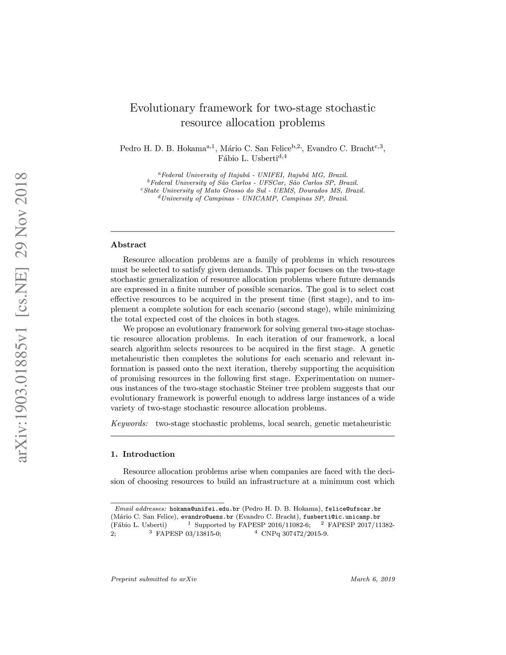 Resource allocation problems are a family of problems in which resources must be selected to satisfy given demands. This paper focuses on the two-stage stochastic generalization of resource allocation problems where future demands are expressed in a finite number of possible scenarios. The goal is to select cost effective resources to be acquired in the present time (first stage), and to implement a complete solution for each scenario (second stage), while minimizing the total expected cost of the choices in both stages. We propose an evolutionary framework for solving general two-stage stochastic resource allocation problems. In each iteration of our framework, a local search algorithm selects resources to be acquired in the first stage. A genetic metaheuristic then completes the solutions for each scenario and relevant information is passed onto the next iteration, thereby supporting the acquisition of promising resources in the following first stage. Experimentation on numerous instances of the two-stage stochastic Steiner tree problem suggests that our evolutionary framework is powerful enough to address large instances of a wide variety of two-stage stochastic resource allocation problems.
