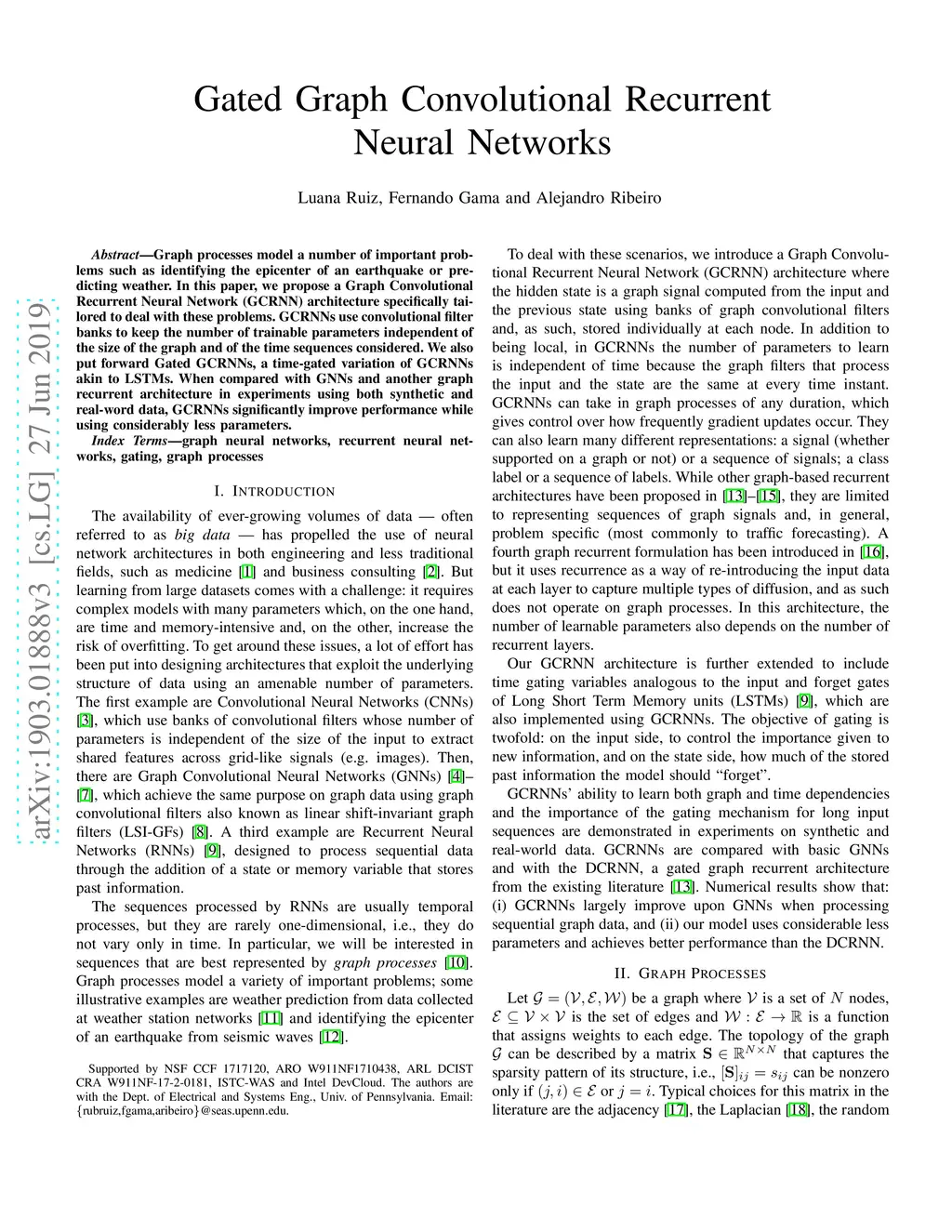 Graph processes model a number of important problems such as identifying the epicenter of an earthquake or predicting weather. In this paper, we propose a Graph Convolutional Recurrent Neural Network (GCRNN) architecture specifically tailored to deal with these problems. GCRNNs use convolutional filter banks to keep the number of trainable parameters independent of the size of the graph and of the time sequences considered. We also put forward Gated GCRNNs, a time-gated variation of GCRNNs akin to LSTMs. When compared with GNNs and another graph recurrent architecture in experiments using both synthetic and real-word data, GCRNNs significantly improve performance while using considerably less parameters.