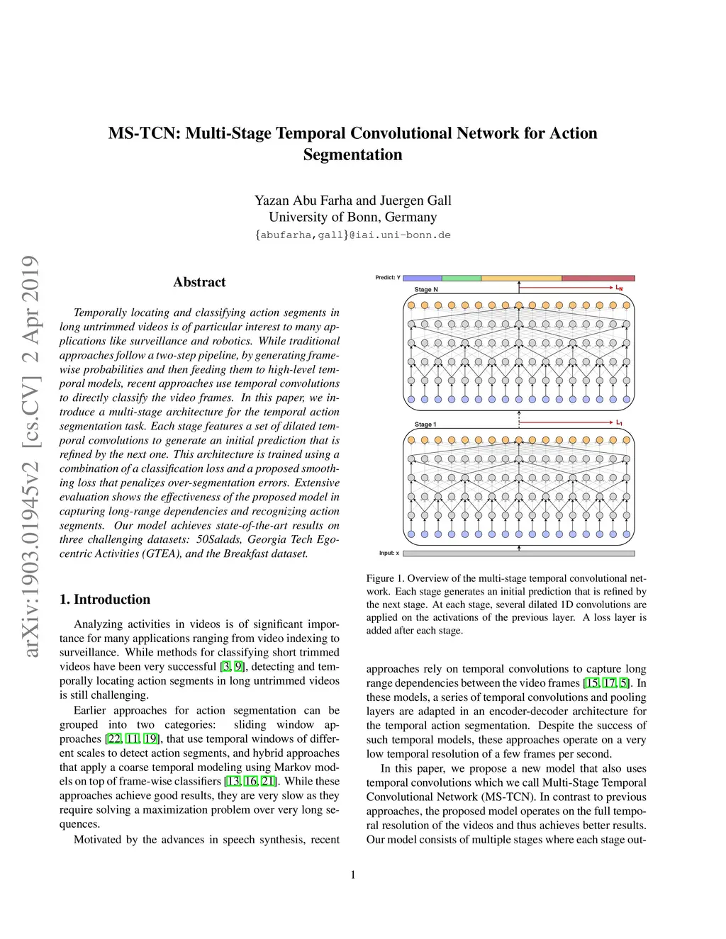 MS-TCN: Multi-Stage Temporal Convolutional Network for Action