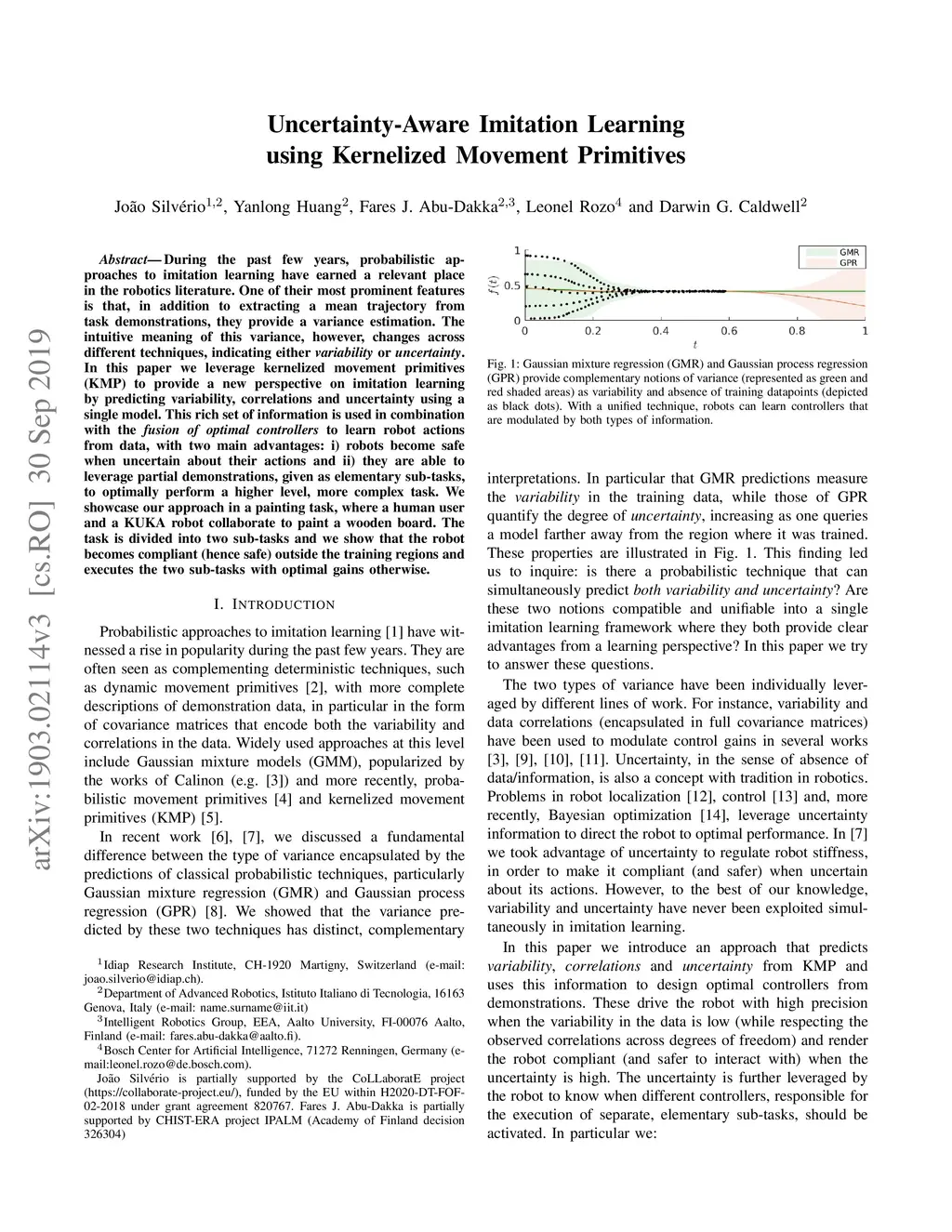 During the past few years, probabilistic approaches to imitation learning have earned a relevant place in the literature. One of their most prominent features, in addition to extracting a mean trajectory from task demonstrations, is that they provide a variance estimation. The intuitive meaning of this variance, however, changes across different techniques, indicating either variability or uncertainty. In this paper we leverage kernelized movement primitives (KMP) to provide a new perspective on imitation learning by predicting variability, correlations and uncertainty about robot actions. This rich set of information is used in combination with optimal controller fusion to learn actions from data, with two main advantages: i) robots become safe when uncertain about their actions and ii) they are able to leverage partial demonstrations, given as elementary sub-tasks, to optimally perform a higher level, more complex task. We showcase our approach in a painting task, where a human user and a KUKA robot collaborate to paint a wooden board. The task is divided into two sub-tasks and we show that using our approach the robot becomes compliant (hence safe) outside the training regions and executes the two sub-tasks with optimal gains.