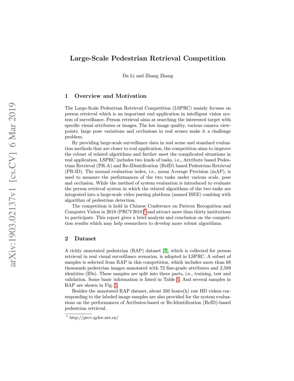 The Large-Scale Pedestrian Retrieval Competition (LSPRC) mainly focuses on person retrieval which is an important end application in intelligent vision system of surveillance. Person retrieval aims at searching the interested target with specific visual attributes or images. The low image quality, various camera viewpoints, large pose variations and occlusions in real scenes make it a challenge problem. By providing large-scale surveillance data in real scene and standard evaluation methods that are closer to real application, the competition aims to improve the robust of related algorithms and further meet the complicated situations in real application. LSPRC includes two kinds of tasks, i.e., Attribute based Pedestrian Retrieval (PR-A) and Re-IDentification (ReID) based Pedestrian Retrieval (PR-ID). The normal evaluation index, i.e., mean Average Precision (mAP), is used to measure the performances of the two tasks under various scale, pose and occlusion. While the method of system evaluation is introduced to evaluate the person retrieval system in which the related algorithms of the two tasks are integrated into a large-scale video parsing platform (named ISEE) combing with algorithm of pedestrian detection.