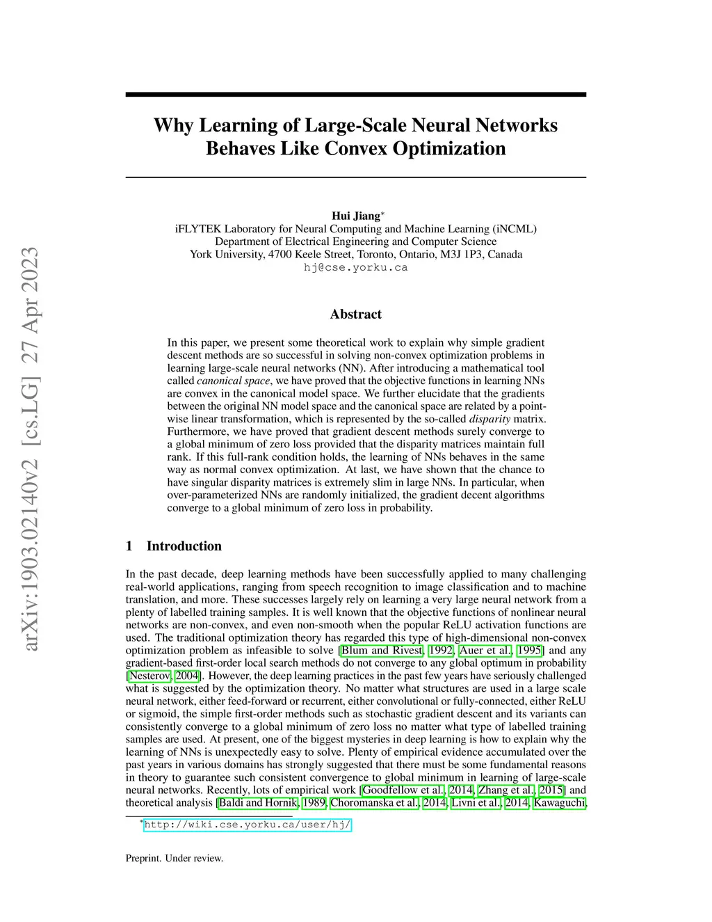 In this paper, we present some theoretical work to explain why simple gradient descent methods are so successful in solving non-convex optimization problems in learning large-scale neural networks (NN). After introducing a mathematical tool called canonical space, we have proved that the objective functions in learning NNs are convex in the canonical model space. We further elucidate that the gradients between the original NN model space and the canonical space are related by a pointwise linear transformation, which is represented by the so-called disparity matrix. Furthermore, we have proved that gradient descent methods surely converge to a global minimum of zero loss provided that the disparity matrices maintain full rank. If this full-rank condition holds, the learning of NNs behaves in the same way as normal convex optimization. At last, we have shown that the chance to have singular disparity matrices is extremely slim in large NNs. In particular, when over-parameterized NNs are randomly initialized, the gradient decent algorithms converge to a global minimum of zero loss in probability.