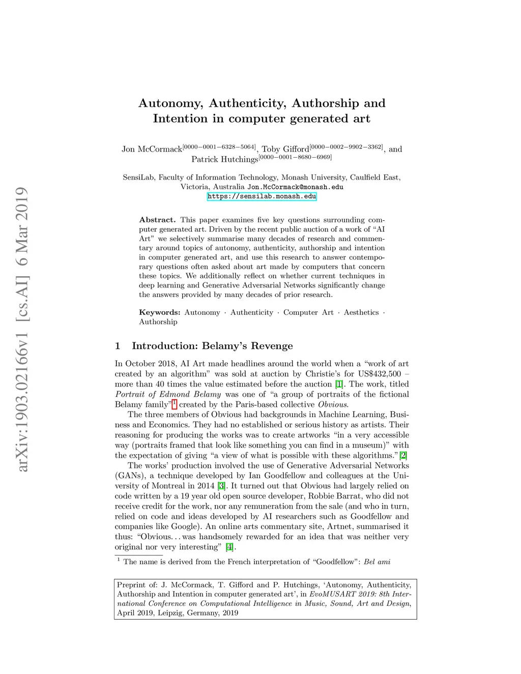 Autonomy, Authenticity, Authorship and Intention in computer generated