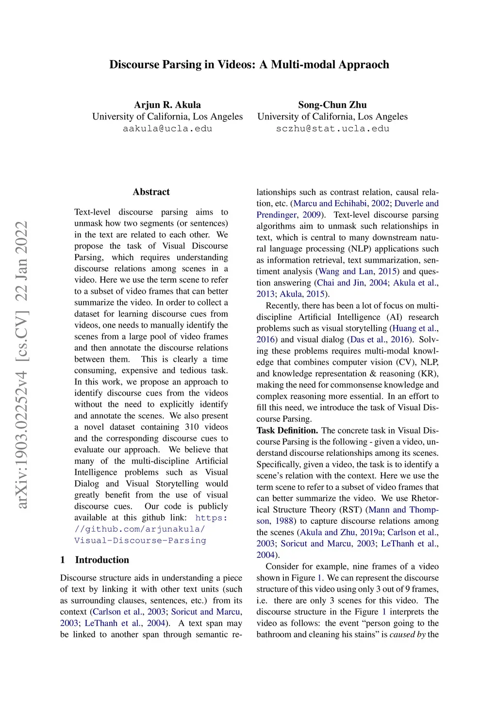 Text-level discourse parsing aims to unmask how two sentences in the text are related to each other. We propose the task of Visual Discourse Parsing, which requires understanding discourse relations among scenes in a video. Here we use the term scene to refer to a subset of video frames that can better summarize the video. In order to collect a dataset for learning discourse cues from videos, one needs to manually identify the scenes from a large pool of video frames and then annotate the discourse relations between them. This is clearly a time consuming, expensive and tedious task. In this work, we propose an approach to identify discourse cues from the videos without the need to explicitly identify and annotate the scenes. We also present a novel dataset containing 310 videos and the corresponding discourse cues to evaluate our approach. We believe that many of the multi-discipline AI problems such as Visual Dialog and Visual Storytelling would greatly benefit from the use of visual discourse cues.