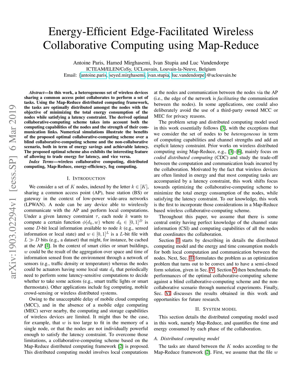 In this work, a heterogeneous set of wireless devices sharing a common access point collaborates to perform a set of tasks. Using the Map-Reduce distributed computing framework, the tasks are optimally distributed amongst the nodes with the objective of minimizing the total energy consumption of the nodes while satisfying a latency constraint. The derived optimal collaborative-computing scheme takes into account both the computing capabilities of the nodes and the strength of their communication links. Numerical simulations illustrate the benefits of the proposed optimal collaborative-computing scheme over a blind collaborative-computing scheme and the non-collaborative scenario, both in term of energy savings and achievable latency. The proposed optimal scheme also exhibits the interesting feature of allowing to trade energy for latency, and vice versa.