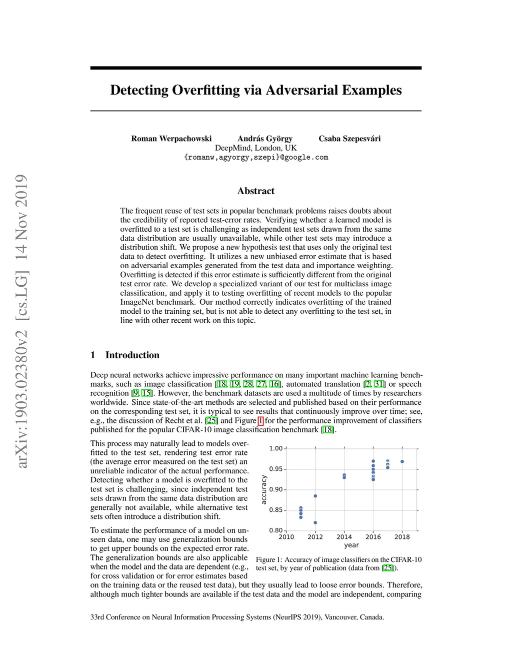 The repeated community-wide reuse of test sets in popular benchmark problems raises doubts about the credibility of reported test-error rates. Verifying whether a learned model is overfitted to a test set is challenging as independent test sets drawn from the same data distribution are usually unavailable, while other test sets may introduce a distribution shift. We propose a new hypothesis test that uses only the original test data to detect overfitting. It utilizes a new unbiased error estimate that is based on adversarial examples generated from the test data and importance weighting. Overfitting is detected if this error estimate is sufficiently different from the original test error rate. We develop a specialized variant of our test for multiclass image classification, and apply it to testing overfitting of recent models to the popular ImageNet benchmark. Our method correctly indicates overfitting of the trained model to the training set, but is not able to detect any overfitting to the test set, in line with other recent work on this topic.