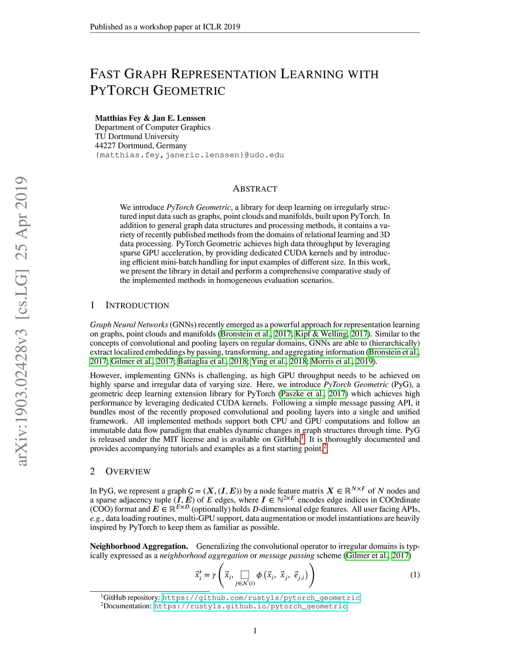 We introduce PyTorch Geometric, a library for deep learning on irregularly structured input data such as graphs, point clouds and manifolds, built upon PyTorch. In addition to general graph data structures and processing methods, it contains a variety of recently published methods from the domains of relational learning and 3D data processing. PyTorch Geometric achieves high data throughput by leveraging sparse GPU acceleration, by providing dedicated CUDA kernels and by introducing efficient mini-batch handling for input examples of different size. In this work, we present the library in detail and perform a comprehensive comparative study of the implemented methods in homogeneous evaluation scenarios.
