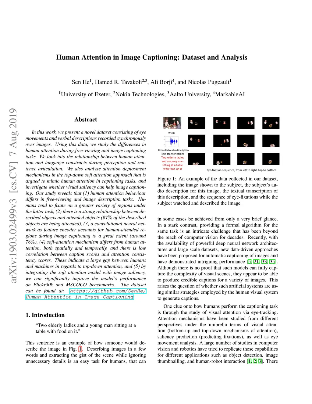 In this work, we present a novel dataset consisting of eye movements and verbal descriptions recorded synchronously over images. Using this data, we study the differences in human attention during free-viewing and image captioning tasks. We look into the relationship between human attention and language constructs during perception and sentence articulation. We also analyse attention deployment mechanisms in the top-down soft attention approach that is argued to mimic human attention in captioning tasks, and investigate whether visual saliency can help image captioning. Our study reveals that (1) human attention behaviour differs in free-viewing and image description tasks. Humans tend to fixate on a greater variety of regions under the latter task, (2) there is a strong relationship between described objects and attended objects ( of the described objects are being attended), (3) a convolutional neural network as feature encoder accounts for human-attended regions during image captioning to a great extent (around ), (4) soft-attention mechanism differs from human attention, both spatially and temporally, and there is low correlation between caption scores and attention consistency scores. These indicate a large gap between humans and machines in regards to top-down attention, and (5) by integrating the soft attention model with image saliency, we can significantly improve the model's performance on Flickr30k and MSCOCO benchmarks. The dataset can be found at: https://github.com/SenHe/Human-Attention-in-Image-Captioning.