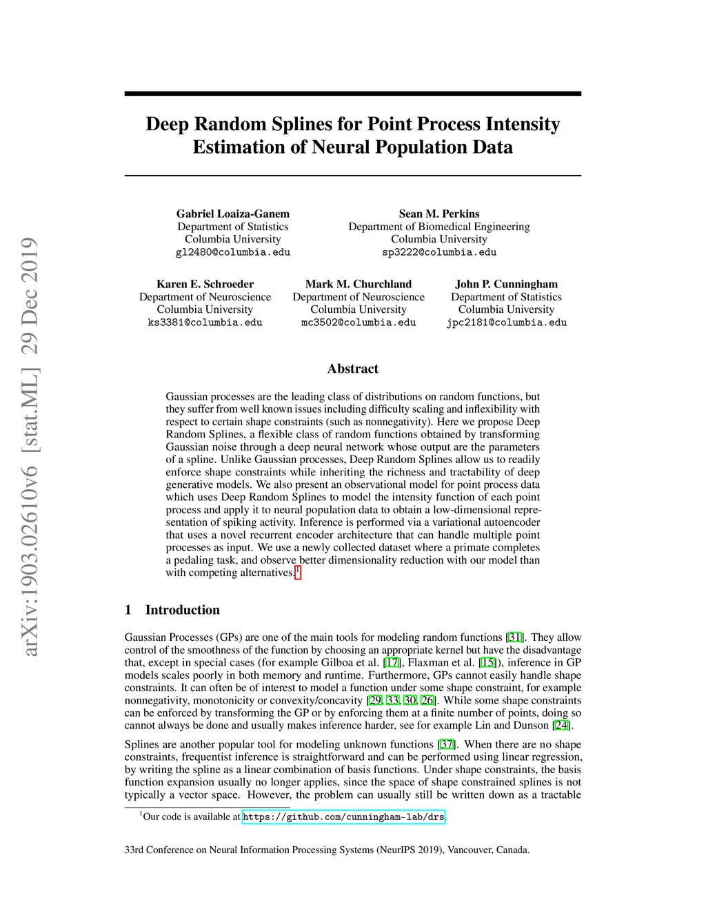 Gaussian processes are the leading class of distributions on random functions, but they suffer from well known issues including difficulty scaling and inflexibility with respect to certain shape constraints (such as nonnegativity). Here we propose Deep Random Splines, a flexible class of random functions obtained by transforming Gaussian noise through a deep neural network whose output are the parameters of a spline. Unlike Gaussian processes, Deep Random Splines allow us to readily enforce shape constraints while inheriting the richness and tractability of deep generative models. We also present an observational model for point process data which uses Deep Random Splines to model the intensity function of each point process and apply it to neural population data to obtain a low-dimensional representation of spiking activity. Inference is performed via a variational autoencoder that uses a novel recurrent encoder architecture that can handle multiple point processes as input. We use a newly collected dataset where a primate completes a pedaling task, and observe better dimensionality reduction with our model than with competing alternatives.