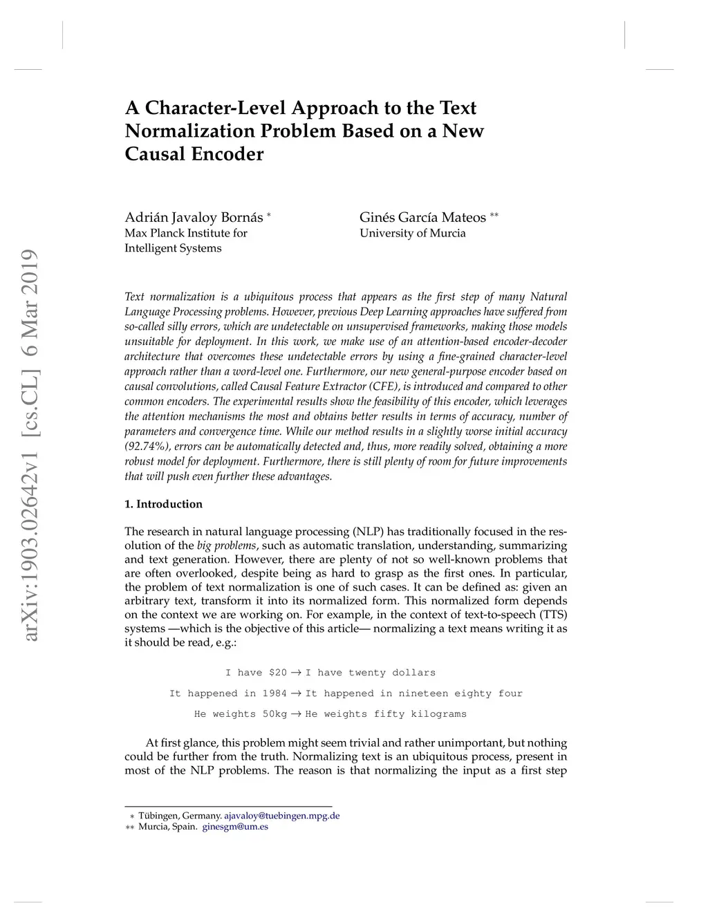 Text normalization is a ubiquitous process that appears as the first step of many Natural Language Processing problems. However, previous Deep Learning approaches have suffered from so-called silly errors, which are undetectable on unsupervised frameworks, making those models unsuitable for deployment. In this work, we make use of an attention-based encoder-decoder architecture that overcomes these undetectable errors by using a fine-grained character-level approach rather than a word-level one. Furthermore, our new general-purpose encoder based on causal convolutions, called Causal Feature Extractor (CFE), is introduced and compared to other common encoders. The experimental results show the feasibility of this encoder, which leverages the attention mechanisms the most and obtains better results in terms of accuracy, number of parameters and convergence time. While our method results in a slightly worse initial accuracy (92.74%), errors can be automatically detected and, thus, more readily solved, obtaining a more robust model for deployment. Furthermore, there is still plenty of room for future improvements that will push even further these advantages.