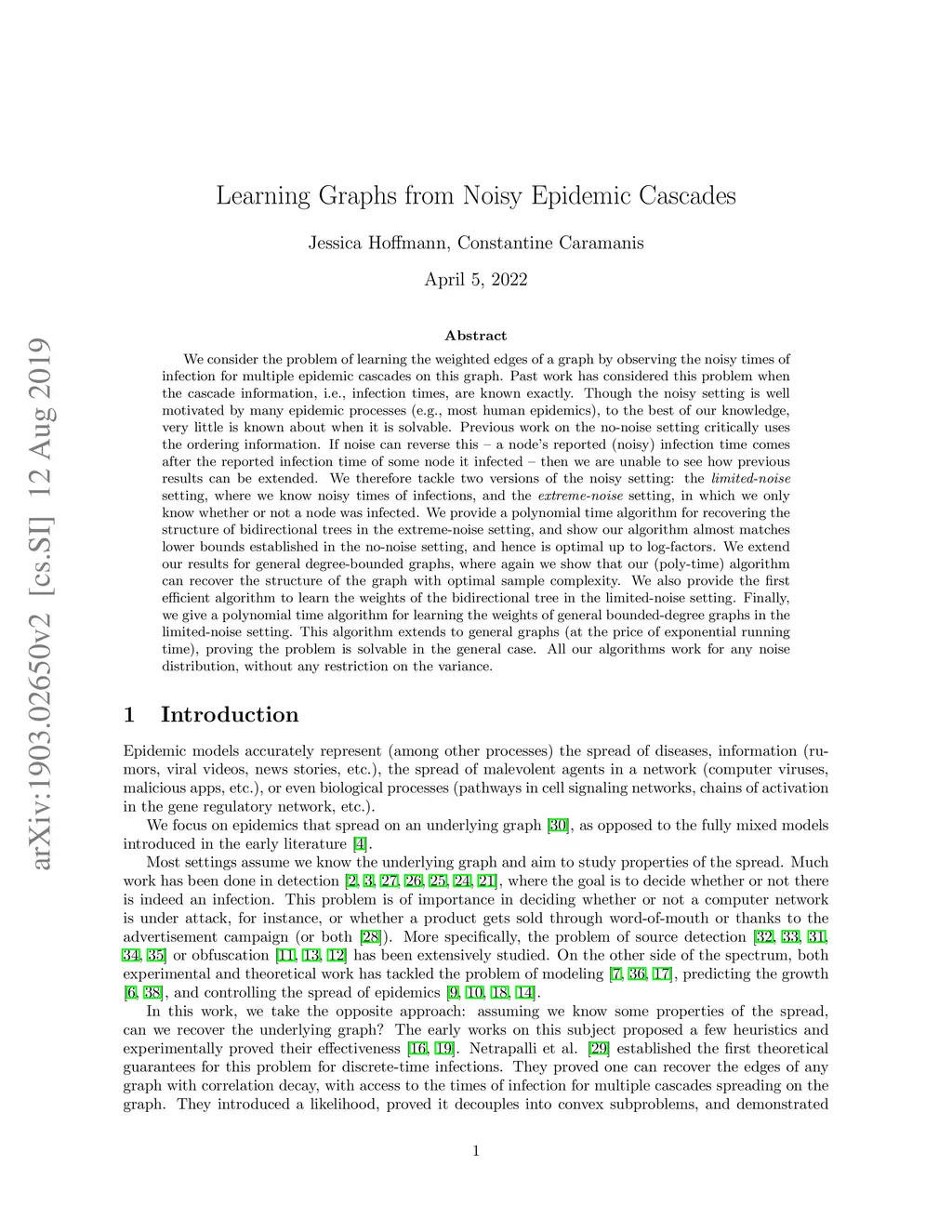We consider the problem of learning the weighted edges of a graph by observing the noisy times of infection for multiple epidemic cascades on this graph. Past work has considered this problem when the cascade information, i.e., infection times, are known exactly. Though the noisy setting is well motivated by many epidemic processes (e.g., most human epidemics), to the best of our knowledge, very little is known about when it is solvable. Previous work on the no-noise setting critically uses the ordering information. If noise can reverse this -- a node's reported (noisy) infection time comes after the reported infection time of some node it infected -- then we are unable to see how previous results can be extended. We therefore tackle two versions of the noisy setting: the limited-noise setting, where we know noisy times of infections, and the extreme-noise setting, in which we only know whether or not a node was infected. We provide a polynomial time algorithm for recovering the structure of bidirectional trees in the extreme-noise setting, and show our algorithm almost matches lower bounds established in the no-noise setting, and hence is optimal up to log-factors. We extend our results for general degree-bounded graphs, where again we show that our (poly-time) algorithm can recover the structure of the graph with optimal sample complexity. We also provide the first efficient algorithm to learn the weights of the bidirectional tree in the limited-noise setting. Finally, we give a polynomial time algorithm for learning the weights of general bounded-degree graphs in the limited-noise setting. This algorithm extends to general graphs (at the price of exponential running time), proving the problem is solvable in the general case. All our algorithms work for any noise distribution, without any restriction on the variance.