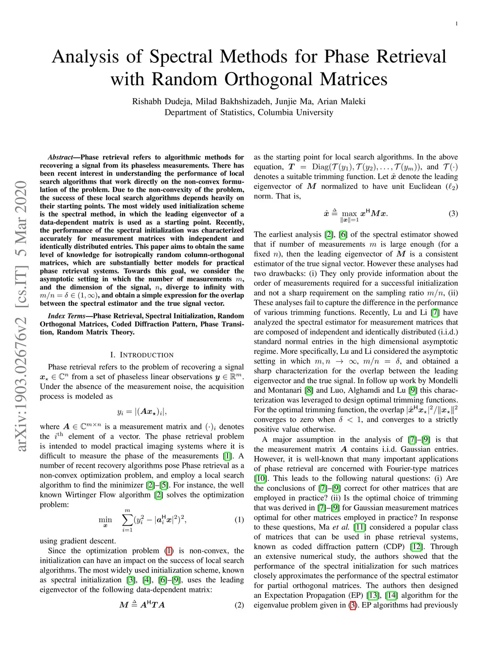 Phase retrieval refers to algorithmic methods for recovering a signal from its phaseless measurements. Local search algorithms that work directly on the non-convex formulation of the problem have been very popular recently. Due to the nonconvexity of the problem, the success of these local search algorithms depends heavily on their starting points. The most widely used initialization scheme is the spectral method, in which the leading eigenvector of a data-dependent matrix is used as a starting point. Recently, the performance of the spectral initialization was characterized accurately for measurement matrices with independent and identically distributed entries. This paper aims to obtain the same level of knowledge for isotropically random column-orthogonal matrices, which are substantially better models for practical phase retrieval systems. Towards this goal, we consider the asymptotic setting in which the number of measurements , and the dimension of the signal, , diverge to infinity with , and obtain a simple expression for the overlap between the spectral estimator and the true signal vector.