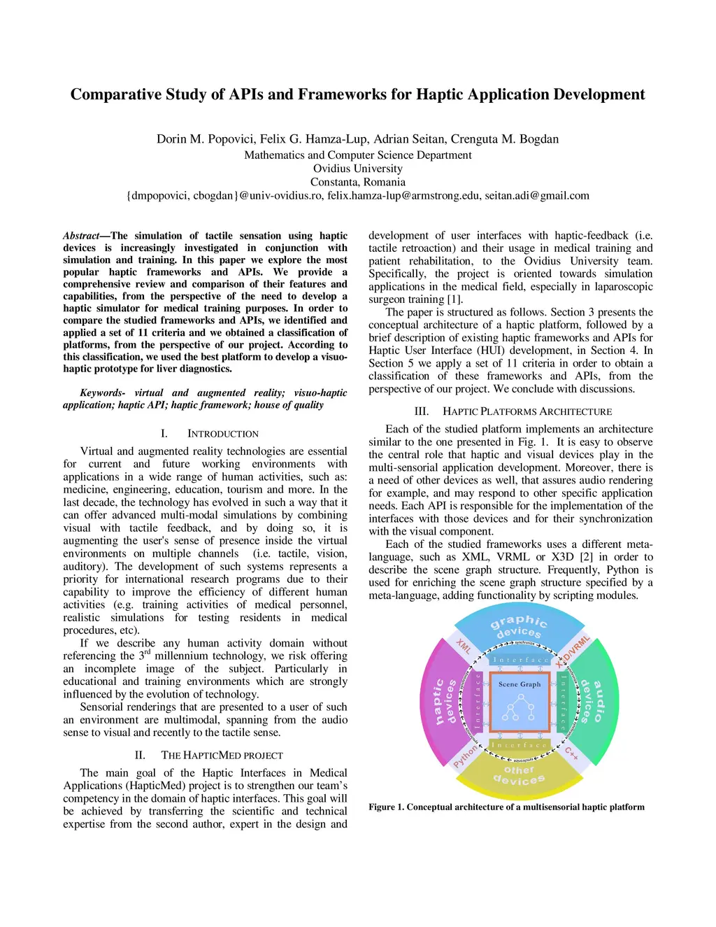 The simulation of tactile sensation using haptic devices is increasingly investigated in conjunction with simulation and training. In this paper we explore the most popular haptic frameworks and APIs. We provide a comprehensive review and comparison of their features and capabilities, from the perspective of the need to develop a haptic simulator for medical training purposes. In order to compare the studied frameworks and APIs, we identified and applied a set of 11 criteria and we obtained a classification of platforms, from the perspective of our project. According to this classification, we used the best platform to develop a visual-haptic prototype for liver diagnostics.