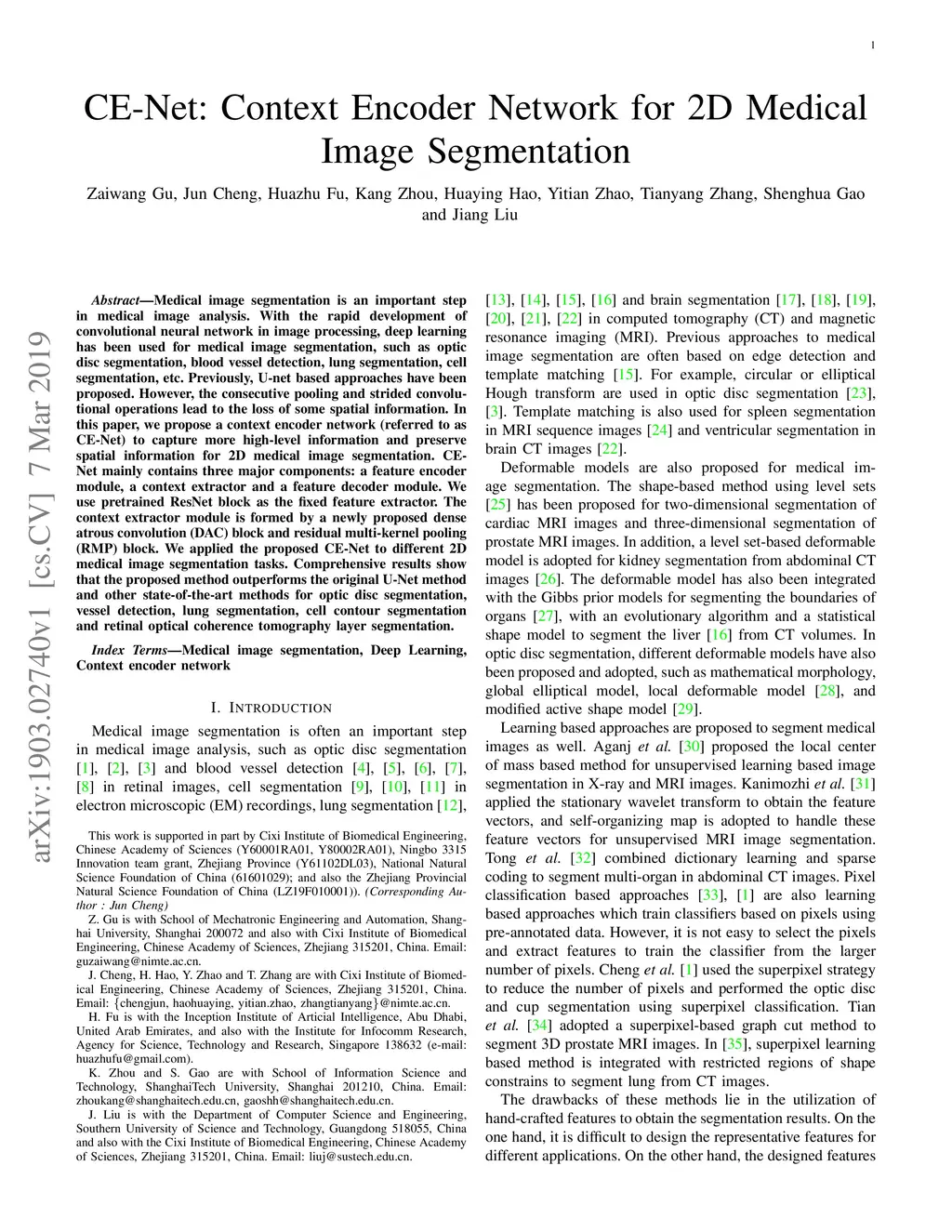 CE-Net: Context Encoder Network for 2D Medical Image Segmentation