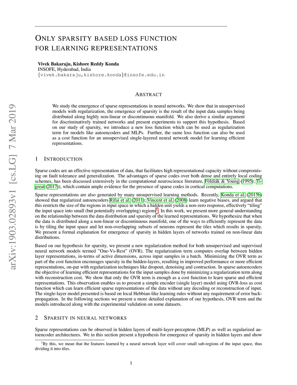 We study the emergence of sparse representations in neural networks. We show that in unsupervised models with regularization, the emergence of sparsity is the result of the input data samples being distributed along highly non-linear or discontinuous manifold. We also derive a similar argument for discriminatively trained networks and present experiments to support this hypothesis. Based on our study of sparsity, we introduce a new loss function which can be used as regularization term for models like autoencoders and MLPs. Further, the same loss function can also be used as a cost function for an unsupervised single-layered neural network model for learning efficient representations.