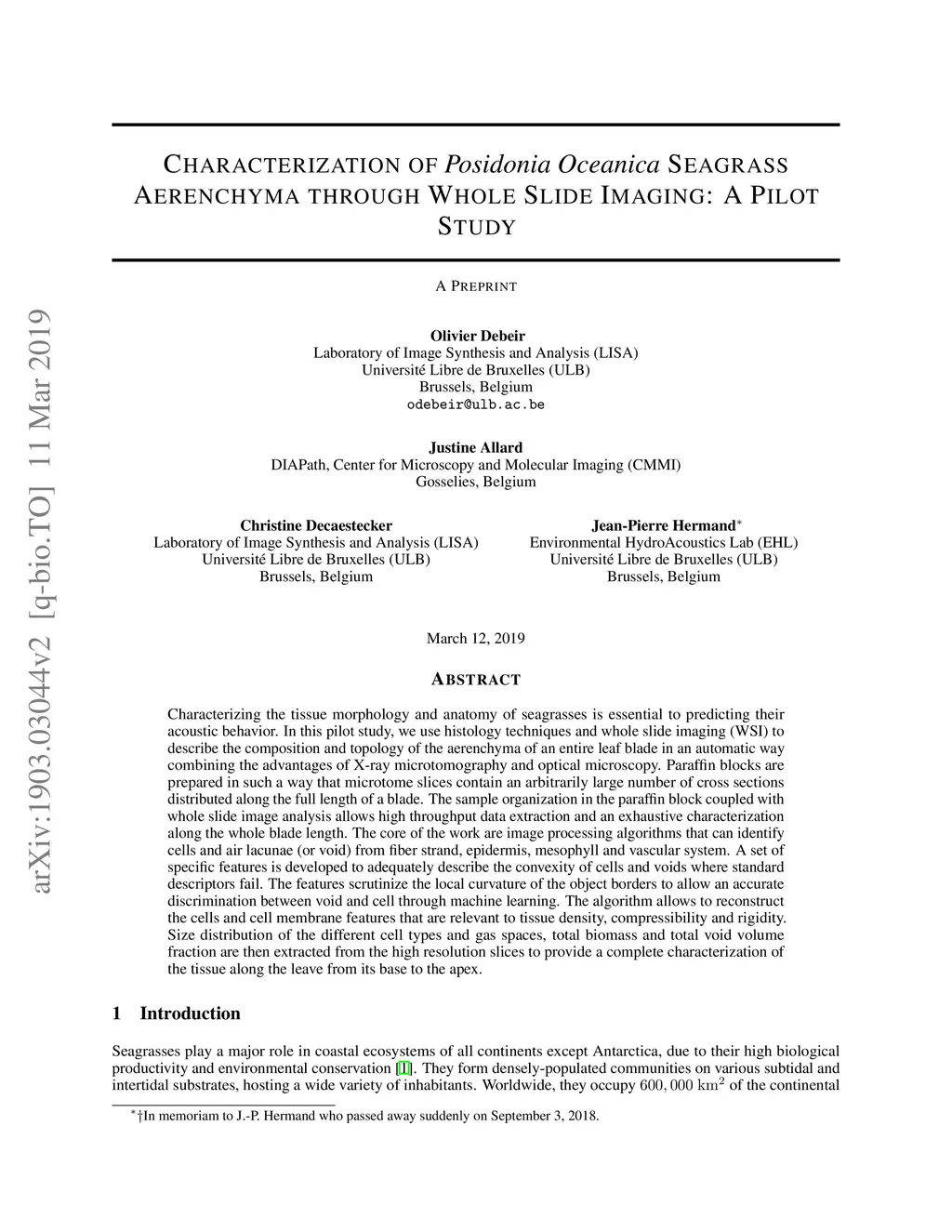 Characterizing the tissue morphology and anatomy of seagrasses is essential to predicting their acoustic behavior. In this pilot study, we use histology techniques and whole slide imaging (WSI) to describe the composition and topology of the aerenchyma of an entire leaf blade in an automatic way combining the advantages of X-ray microtomography and optical microscopy. Paraffin blocks are prepared in such a way that microtome slices contain an arbitrarily large number of cross sections distributed along the full length of a blade. The sample organization in the paraffin block coupled with whole slide image analysis allows high throughput data extraction and an exhaustive characterization along the whole blade length. The core of the work are image processing algorithms that can identify cells and air lacunae (or void) from fiber strand, epidermis, mesophyll and vascular system. A set of specific features is developed to adequately describe the convexity of cells and voids where standard descriptors fail. The features scrutinize the local curvature of the object borders to allow an accurate discrimination between void and cell through machine learning. The algorithm allows to reconstruct the cells and cell membrane features that are relevant to tissue density, compressibility and rigidity. Size distribution of the different cell types and gas spaces, total biomass and total void volume fraction are then extracted from the high resolution slices to provide a complete characterization of the tissue along the leave from its base to the apex.