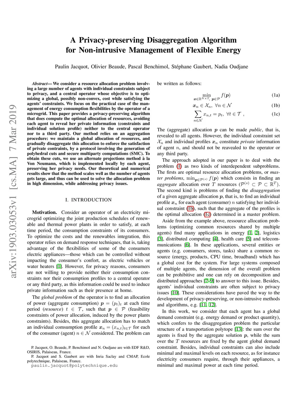 We consider a resource allocation problem involving a large number of agents with individual constraints subject to privacy, and a central operator whose objective is to optimizing a global, possibly non-convex, cost while satisfying the agents'c onstraints. We focus on the practical case of the management of energy consumption flexibilities by the operator of a microgrid. This paper provides a privacy-preserving algorithm that does compute the optimal allocation of resources, avoiding each agent to reveal her private information (constraints and individual solution profile) neither to the central operator nor to a third party. Our method relies on an aggregation procedure: we maintain a global allocation of resources, and gradually disaggregate this allocation to enforce the satisfaction of private contraints, by a protocol involving the generation of polyhedral cuts and secure multiparty computations (SMC). To obtain these cuts, we use an alternate projections method \`a la Von Neumann, which is implemented locally by each agent, preserving her privacy needs. Our theoretical and numerical results show that the method scales well as the number of agents gets large, and thus can be used to solve the allocation problem in high dimension, while addressing privacy issues.
