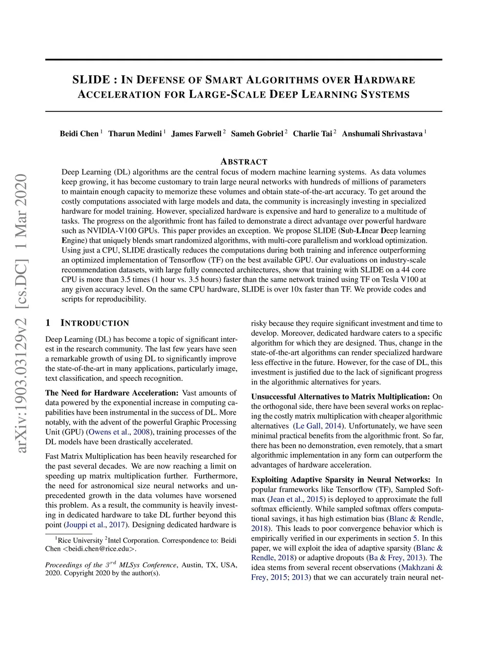 SLIDE : In Defense of Smart Algorithms over Hardware Acceleration for