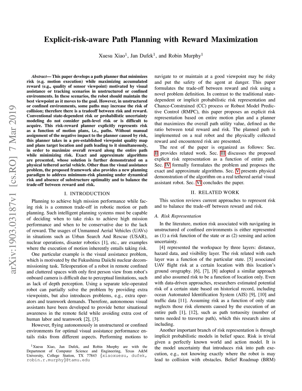Explicit-risk-aware Path Planning with Reward Maximization