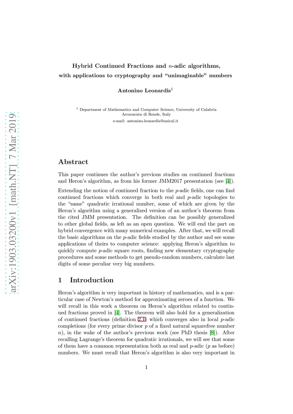 This paper continues the author's previous studies on continued fractions and Heron's algorithm, as from his former JMM2017 presentation (see \cite{CF.HA}).\par\medskip Extending the notion of continued fraction to the -adic fields, one can find continued fractions which converge in both real and -adic topologies to the `same' quadratic irrational number, some of which are given by the Heron's algorithm using a generalized version of an author's theorem from the cited JMM presentation. The definition can be possibly generalized to other global fields, as left as an open question. We will end the part on hybrid convergence with many numerical examples. After that, we will recall the basic algorithms on the -adic fields studied by the author and see some applications of theirs to computer science: applying Heron's algorithm to quickly compute -adic square roots, finding new elementary cryptography procedures and some methods to get pseudo-random numbers, calculate last digits of some peculiar very big numbers.