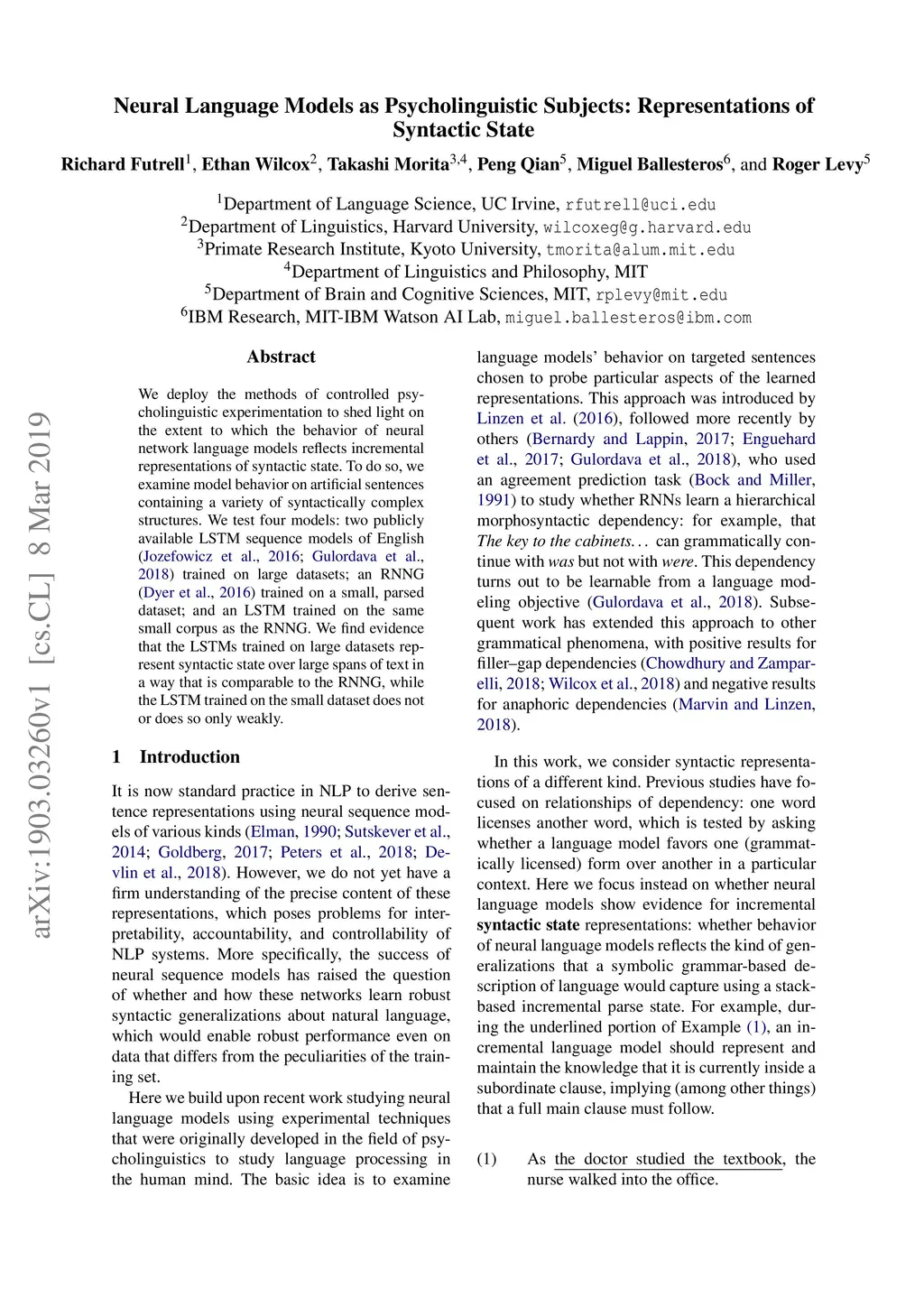 We deploy the methods of controlled psycholinguistic experimentation to shed light on the extent to which the behavior of neural network language models reflects incremental representations of syntactic state. To do so, we examine model behavior on artificial sentences containing a variety of syntactically complex structures. We test four models: two publicly available LSTM sequence models of English (Jozefowicz et al., 2016; Gulordava et al., 2018) trained on large datasets; an RNNG (Dyer et al., 2016) trained on a small, parsed dataset; and an LSTM trained on the same small corpus as the RNNG. We find evidence that the LSTMs trained on large datasets represent syntactic state over large spans of text in a way that is comparable to the RNNG, while the LSTM trained on the small dataset does not or does so only weakly.