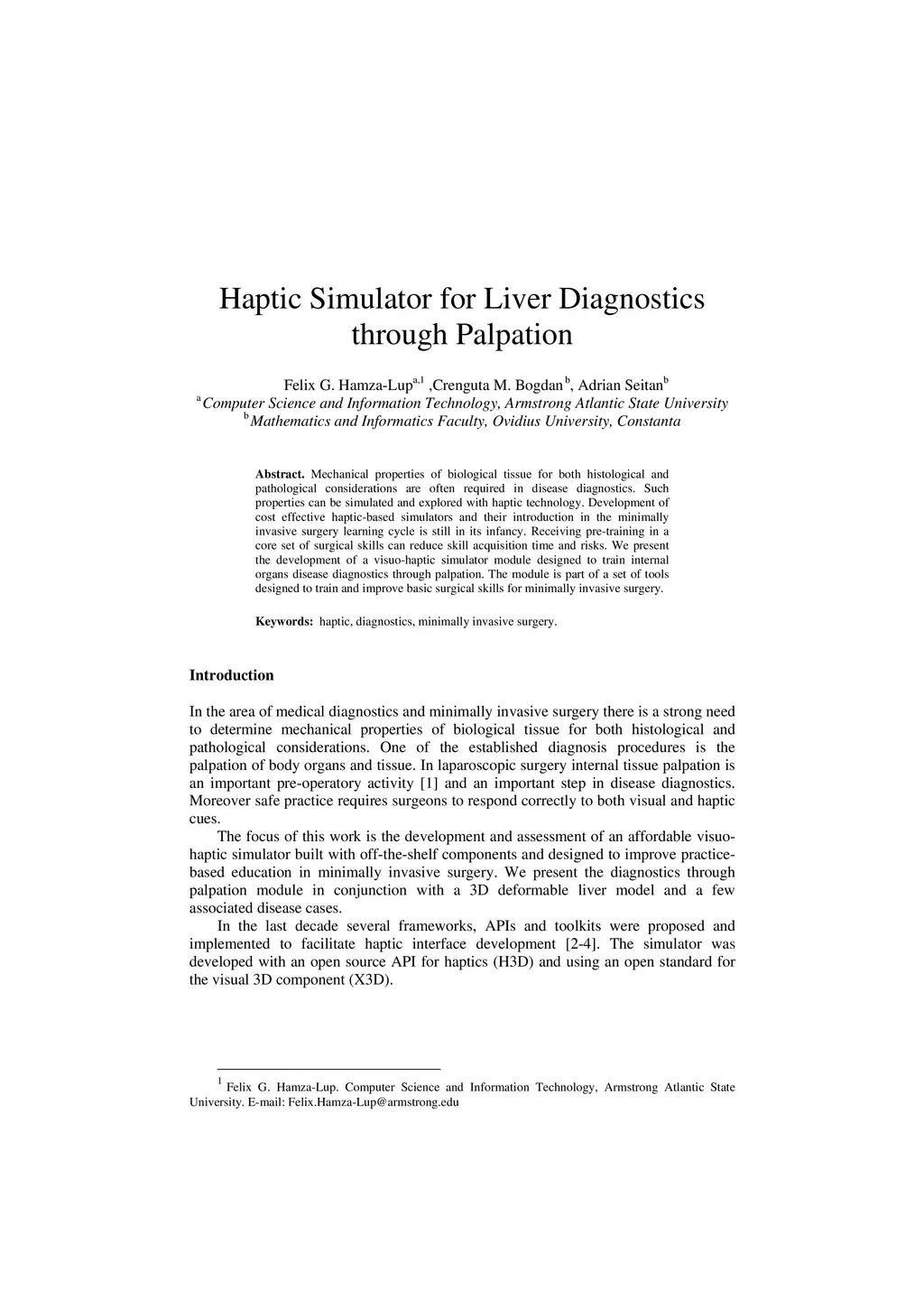 Mechanical properties of biological tissue for both histological and pathological considerations are often required in disease diagnostics. Such properties can be simulated and explored with haptic technology. Development of cost effective haptic-based simulators and their introduction in the minimally invasive surgery learning cycle is still in its infancy. Receiving pretraining in a core set of surgical skills can reduce skill acquisition time and risks. We present the development of a visuo-haptic simulator module designed to train internal organs disease diagnostics through palpation. The module is part of a set of tools designed to train and improve basic surgical skills for minimally invasive surgery.