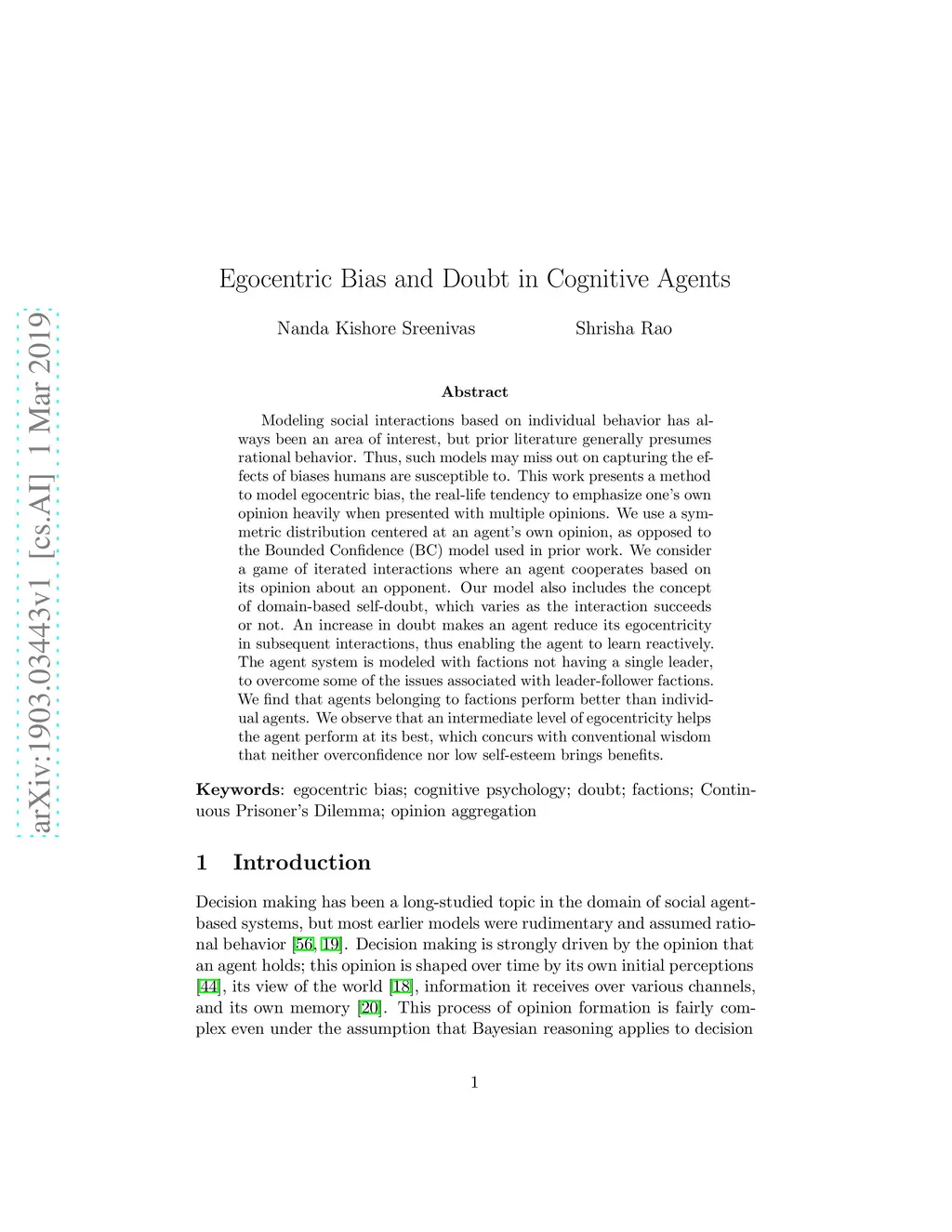 Modeling social interactions based on individual behavior has always been an area of interest, but prior literature generally presumes rational behavior. Thus, such models may miss out on capturing the effects of biases humans are susceptible to. This work presents a method to model egocentric bias, the real-life tendency to emphasize one's own opinion heavily when presented with multiple opinions. We use a symmetric distribution centered at an agent's own opinion, as opposed to the Bounded Confidence (BC) model used in prior work. We consider a game of iterated interactions where an agent cooperates based on its opinion about an opponent. Our model also includes the concept of domain-based self-doubt, which varies as the interaction succeeds or not. An increase in doubt makes an agent reduce its egocentricity in subsequent interactions, thus enabling the agent to learn reactively. The agent system is modeled with factions not having a single leader, to overcome some of the issues associated with leader-follower factions. We find that agents belonging to factions perform better than individual agents. We observe that an intermediate level of egocentricity helps the agent perform at its best, which concurs with conventional wisdom that neither overconfidence nor low self-esteem brings benefits.