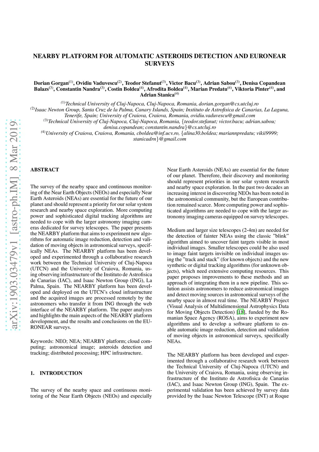 The survey of the nearby space and continuous monitoring of the Near Earth Objects (NEOs) and especially Near Earth Asteroids (NEAs) are essential for the future of our planet and should represent a priority for our solar system research and nearby space exploration. More computing power and sophisticated digital tracking algorithms are needed to cope with the larger astronomy imaging cameras dedicated for survey telescopes. The paper presents the NEARBY platform that aims to experiment new algorithms for automatic image reduction, detection and validation of moving objects in astronomical surveys, specifically NEAs. The NEARBY platform has been developed and experimented through a collaborative research work between the Technical University of Cluj-Napoca (UTCN) and the University of Craiova, Romania, using observing infrastructure of the Instituto de Astrofisica de Canarias (IAC) and Isaac Newton Group (ING), La Palma, Spain. The NEARBY platform has been developed and deployed on the UTCN's cloud infrastructure and the acquired images are processed remotely by the astronomers who transfer it from ING through the web interface of the NEARBY platform. The paper analyzes and highlights the main aspects of the NEARBY platform development, and the results and conclusions on the EURONEAR surveys.