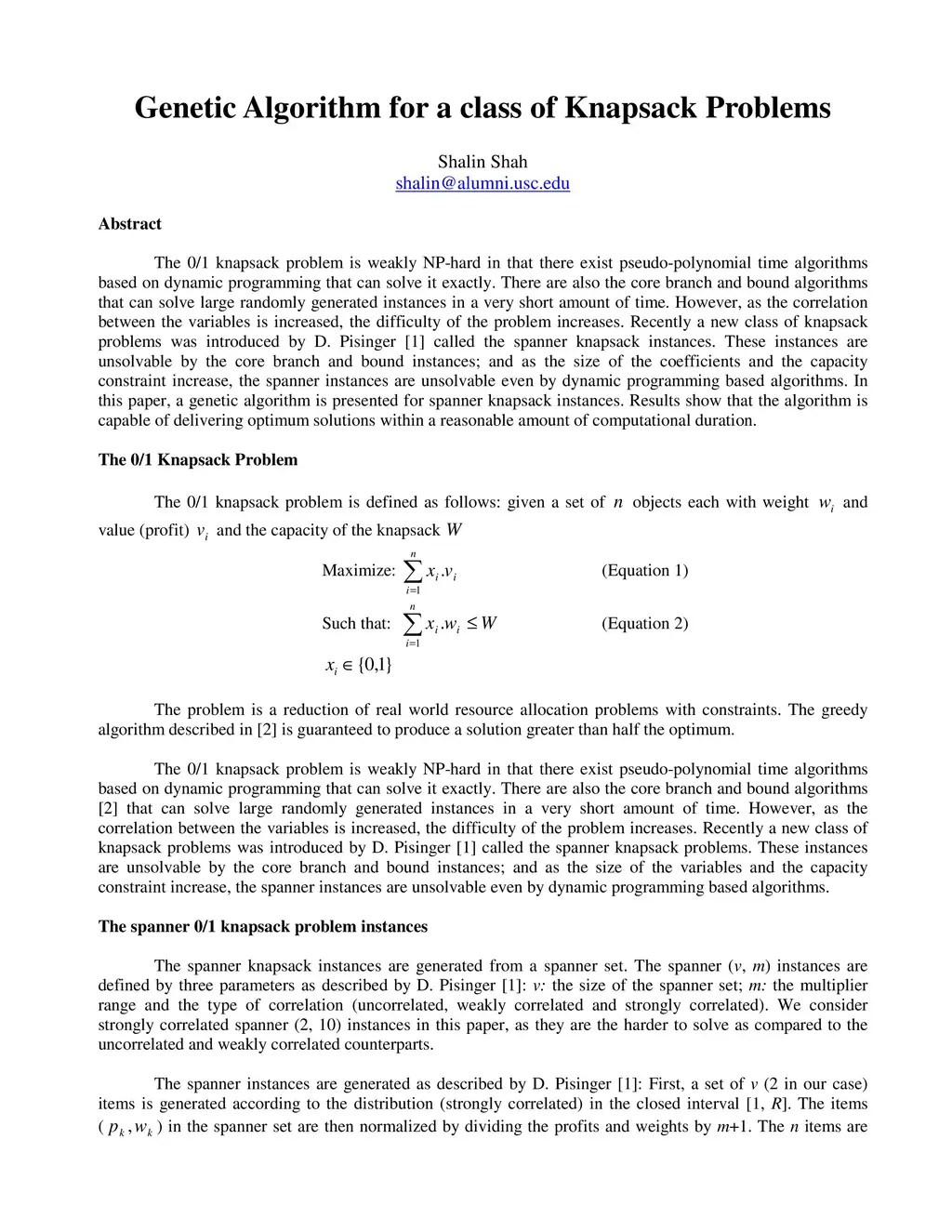 Genetic Algorithm for a class of Knapsack Problems