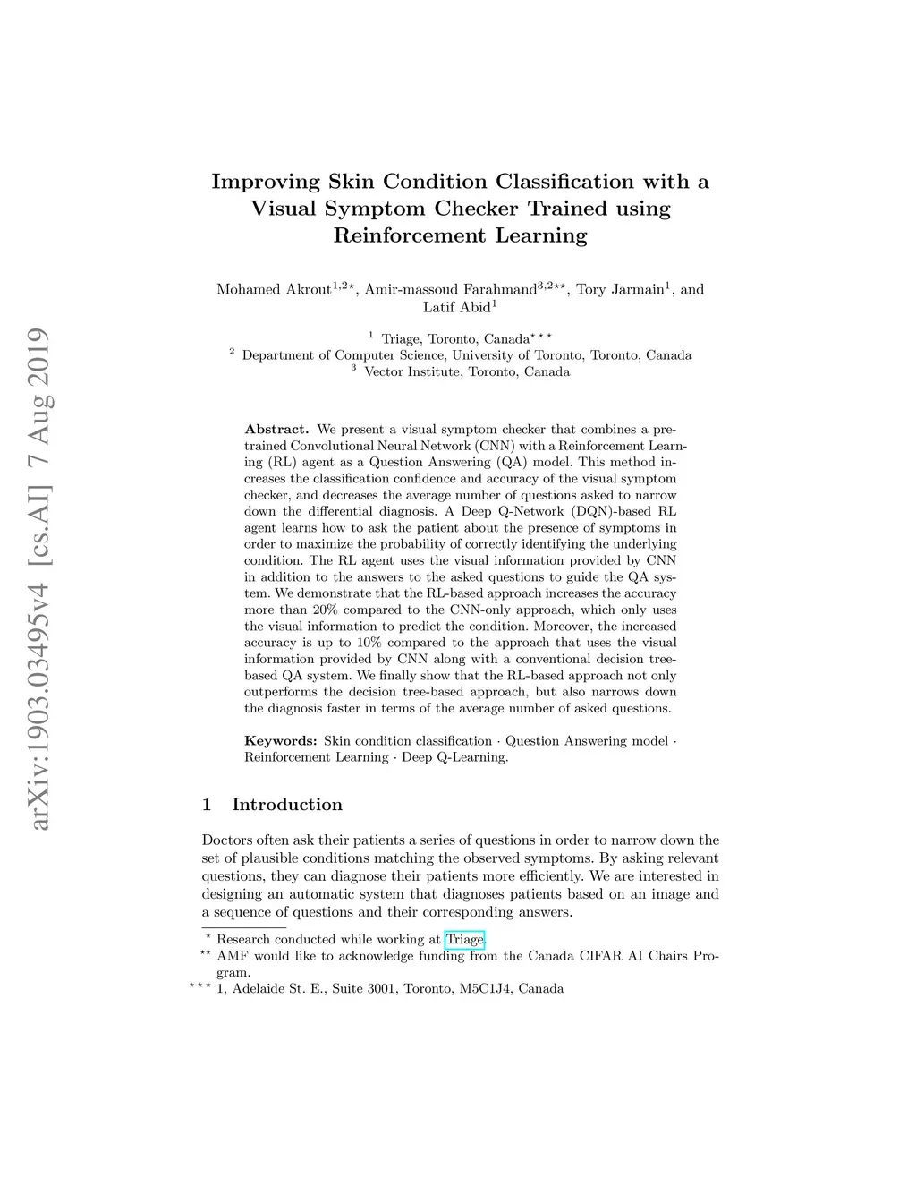 We present a visual symptom checker that combines a pre-trained Convolutional Neural Network (CNN) with a Reinforcement Learning (RL) agent as a Question Answering (QA) model. This method increases the classification confidence and accuracy of the visual symptom checker, and decreases the average number of questions asked to narrow down the differential diagnosis. A Deep Q-Network (DQN)-based RL agent learns how to ask the patient about the presence of symptoms in order to maximize the probability of correctly identifying the underlying condition. The RL agent uses the visual information provided by CNN in addition to the answers to the asked questions to guide the QA system. We demonstrate that the RL-based approach increases the accuracy more than 20% compared to the CNN-only approach, which only uses the visual information to predict the condition. Moreover, the increased accuracy is up to 10% compared to the approach that uses the visual information provided by CNN along with a conventional decision tree-based QA system. We finally show that the RL-based approach not only outperforms the decision tree-based approach, but also narrows down the diagnosis faster in terms of the average number of asked questions.