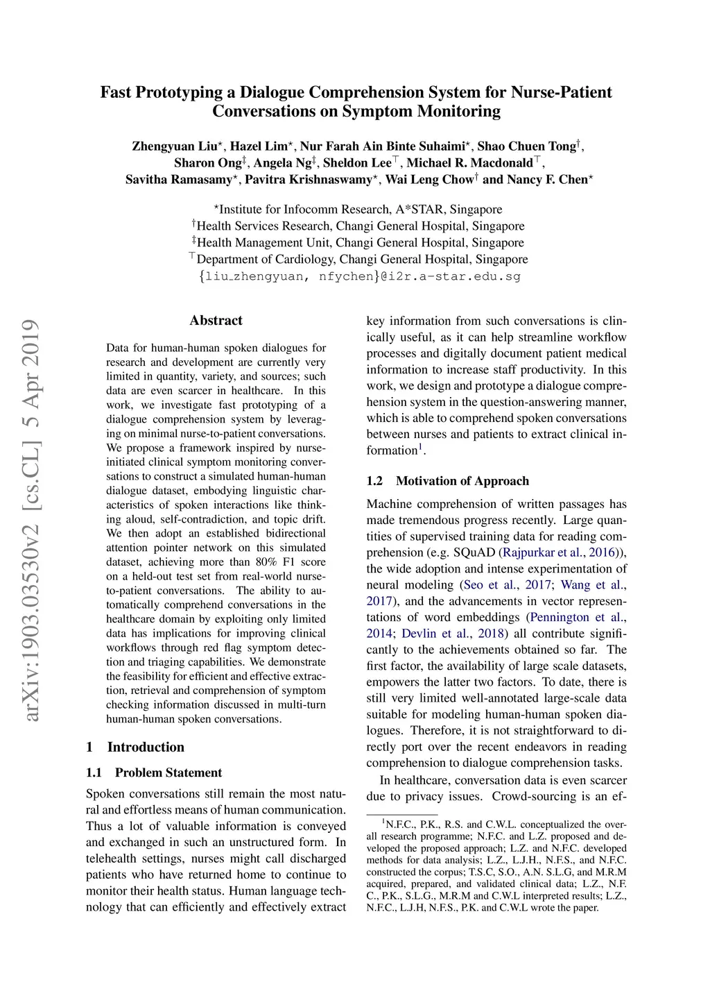 Data for human-human spoken dialogues for research and development are currently very limited in quantity, variety, and sources; such data are even scarcer in healthcare. In this work, we investigate fast prototyping of a dialogue comprehension system by leveraging on minimal nurse-to-patient conversations. We propose a framework inspired by nurse-initiated clinical symptom monitoring conversations to construct a simulated human-human dialogue dataset, embodying linguistic characteristics of spoken interactions like thinking aloud, self-contradiction, and topic drift. We then adopt an established bidirectional attention pointer network on this simulated dataset, achieving more than 80% F1 score on a held-out test set from real-world nurse-to-patient conversations. The ability to automatically comprehend conversations in the healthcare domain by exploiting only limited data has implications for improving clinical workflows through red flag symptom detection and triaging capabilities. We demonstrate the feasibility for efficient and effective extraction, retrieval and comprehension of symptom checking information discussed in multi-turn human-human spoken conversations.