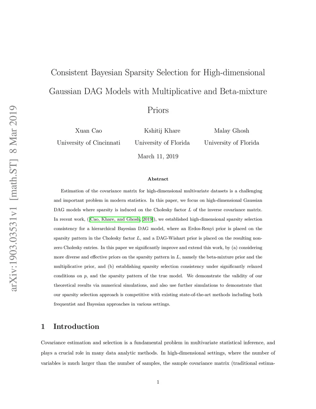Estimation of the covariance matrix for high-dimensional multivariate datasets is a challenging and important problem in modern statistics. In this paper, we focus on high-dimensional Gaussian DAG models where sparsity is induced on the Cholesky factor L of the inverse covariance matrix. In recent work, ([Cao, Khare, and Ghosh, 2019]), we established high-dimensional sparsity selection consistency for a hierarchical Bayesian DAG model, where an Erdos-Renyi prior is placed on the sparsity pattern in the Cholesky factor L, and a DAG-Wishart prior is placed on the resulting non-zero Cholesky entries. In this paper we significantly improve and extend this work, by (a) considering more diverse and effective priors on the sparsity pattern in L, namely the beta-mixture prior and the multiplicative prior, and (b) establishing sparsity selection consistency under significantly relaxed conditions on p, and the sparsity pattern of the true model. We demonstrate the validity of our theoretical results via numerical simulations, and also use further simulations to demonstrate that our sparsity selection approach is competitive with existing state-of-the-art methods including both frequentist and Bayesian approaches in various settings.