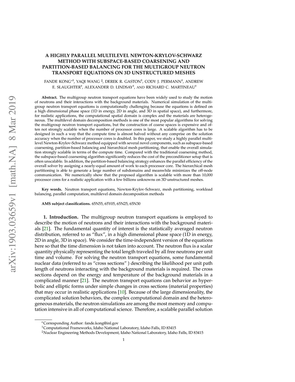 The multigroup neutron transport equations have been widely used to study the motion of neutrons and their interactions with the background materials. Numerical simulation of the multigroup neutron transport equations is computationally challenging because the equations is defined on a high dimensional phase space (1D in energy, 2D in angle, and 3D in spatial space), and furthermore, for realistic applications, the computational spatial domain is complex and the materials are heterogeneous. The multilevel domain decomposition methods is one of the most popular algorithms for solving the multigroup neutron transport equations, but the construction of coarse spaces is expensive and often not strongly scalable when the number of processor cores is large. In this paper, we study a highly parallel multilevel Newton-Krylov-Schwarz method equipped with several novel components, such as subspace-based coarsening, partition-based balancing and hierarchical mesh partitioning, that enable the overall simulation strongly scalable in terms of the compute time. Compared with the traditional coarsening method, the subspace-based coarsening algorithm significantly reduces the cost of the preconditioner setup that is often unscalable. In addition, the partition-based balancing strategy enhances the parallel efficiency of the overall solver by assigning a nearly-equal amount of work to each processor core. The hierarchical mesh partitioning is able to generate a large number of subdomains and meanwhile minimizes the off-node communication. We numerically show that the proposed algorithm is scalable with more than 10,000 processor cores for a realistic application with a few billions unknowns on 3D unstructured meshes.