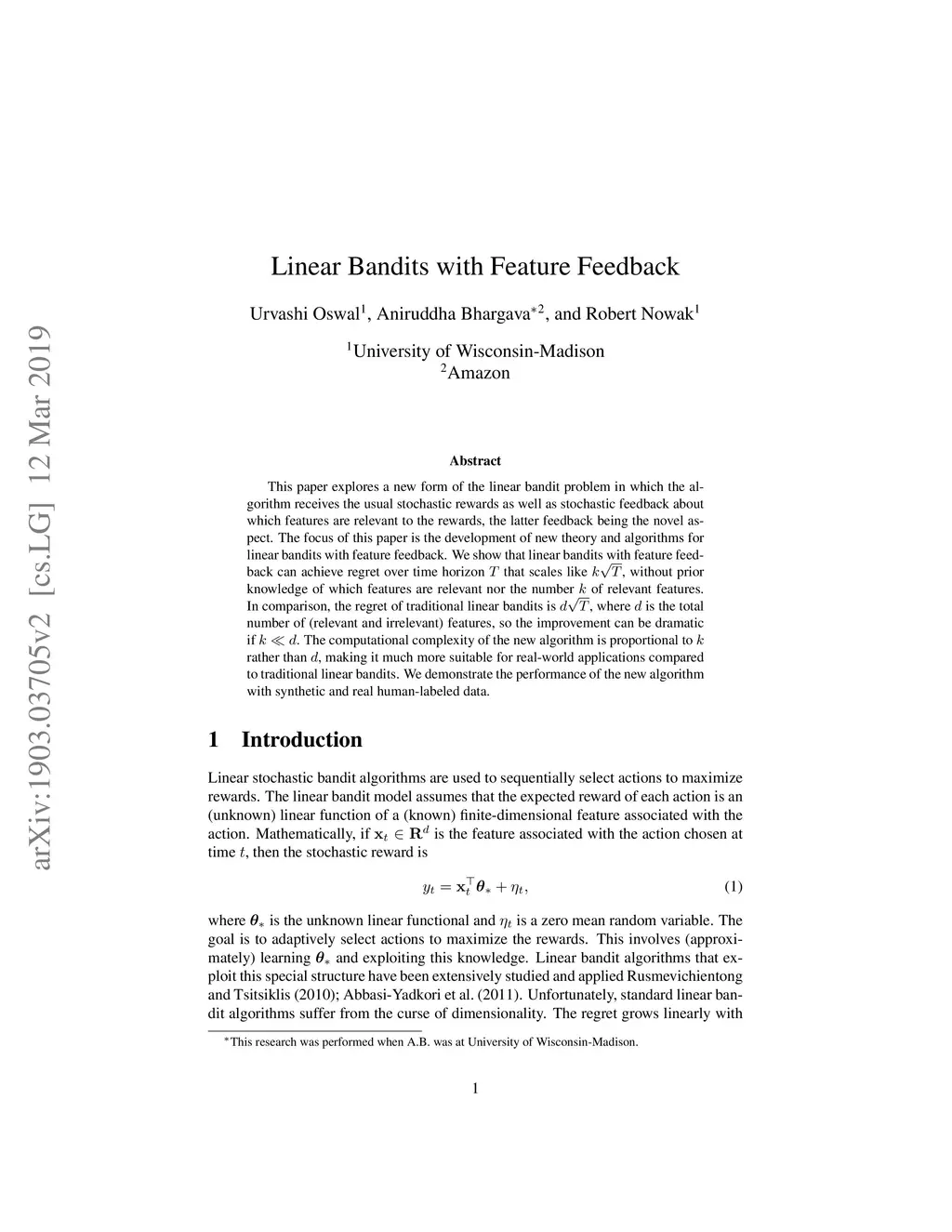 This paper explores a new form of the linear bandit problem in which the algorithm receives the usual stochastic rewards as well as stochastic feedback about which features are relevant to the rewards, the latter feedback being the novel aspect. The focus of this paper is the development of new theory and algorithms for linear bandits with feature feedback. We show that linear bandits with feature feedback can achieve regret over time horizon that scales like , without prior knowledge of which features are relevant nor the number of relevant features. In comparison, the regret of traditional linear bandits is , where is the total number of (relevant and irrelevant) features, so the improvement can be dramatic if . The computational complexity of the new algorithm is proportional to rather than , making it much more suitable for real-world applications compared to traditional linear bandits. We demonstrate the performance of the new algorithm with synthetic and real human-labeled data.