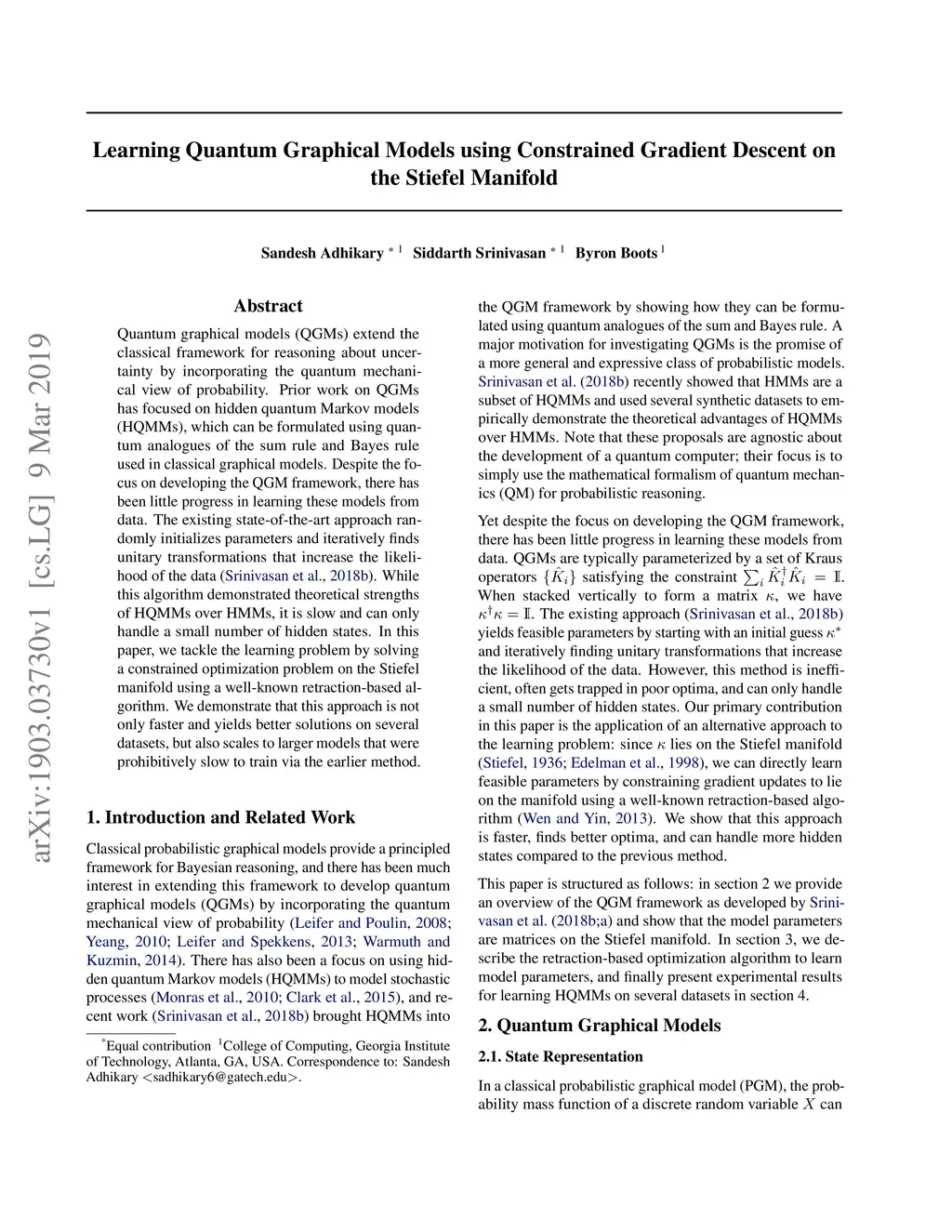 Quantum graphical models (QGMs) extend the classical framework for reasoning about uncertainty by incorporating the quantum mechanical view of probability. Prior work on QGMs has focused on hidden quantum Markov models (HQMMs), which can be formulated using quantum analogues of the sum rule and Bayes rule used in classical graphical models. Despite the focus on developing the QGM framework, there has been little progress in learning these models from data. The existing state-of-the-art approach randomly initializes parameters and iteratively finds unitary transformations that increase the likelihood of the data. While this algorithm demonstrated theoretical strengths of HQMMs over HMMs, it is slow and can only handle a small number of hidden states. In this paper, we tackle the learning problem by solving a constrained optimization problem on the Stiefel manifold using a well-known retraction-based algorithm. We demonstrate that this approach is not only faster and yields better solutions on several datasets, but also scales to larger models that were prohibitively slow to train via the earlier method.