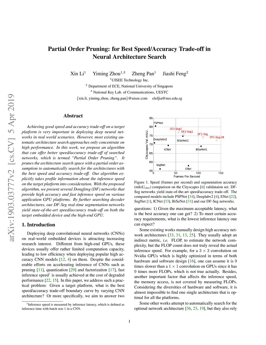 Achieving good speed and accuracy trade-off on a target platform is very important in deploying deep neural networks in real world scenarios. However, most existing automatic architecture search approaches only concentrate on high performance. In this work, we propose an algorithm that can offer better speed/accuracy trade-off of searched networks, which is termed "Partial Order Pruning". It prunes the architecture search space with a partial order assumption to automatically search for the architectures with the best speed and accuracy trade-off. Our algorithm explicitly takes profile information about the inference speed on the target platform into consideration. With the proposed algorithm, we present several Dongfeng (DF) networks that provide high accuracy and fast inference speed on various application GPU platforms. By further searching decoder architectures, our DF-Seg real-time segmentation networks yield state-of-the-art speed/accuracy trade-off on both the target embedded device and the high-end GPU.