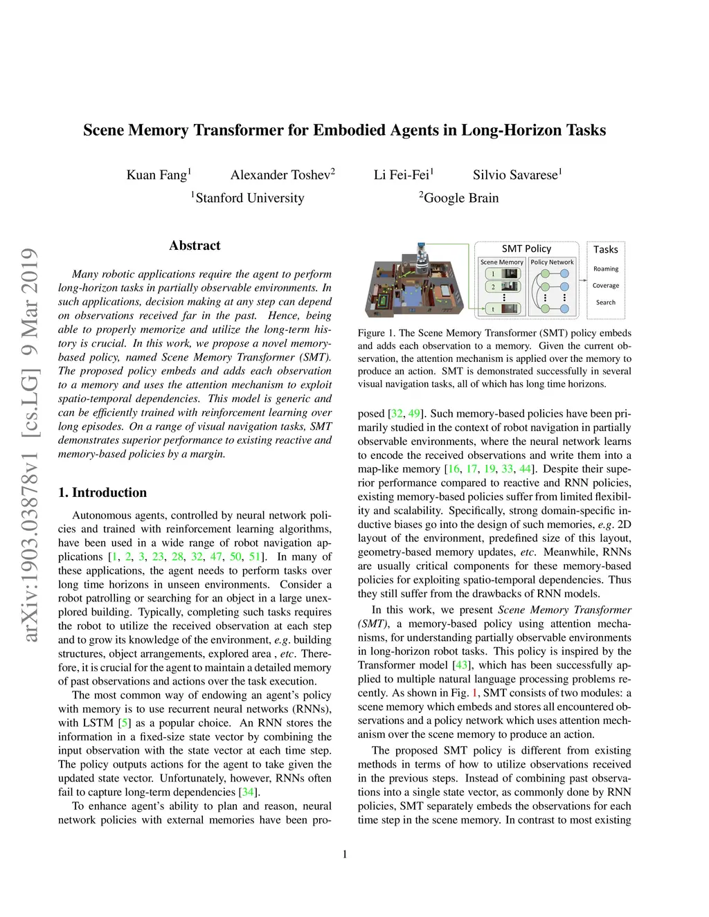 Many robotic applications require the agent to perform long-horizon tasks in partially observable environments. In such applications, decision making at any step can depend on observations received far in the past. Hence, being able to properly memorize and utilize the long-term history is crucial. In this work, we propose a novel memory-based policy, named Scene Memory Transformer (SMT). The proposed policy embeds and adds each observation to a memory and uses the attention mechanism to exploit spatio-temporal dependencies. This model is generic and can be efficiently trained with reinforcement learning over long episodes. On a range of visual navigation tasks, SMT demonstrates superior performance to existing reactive and memory-based policies by a margin.