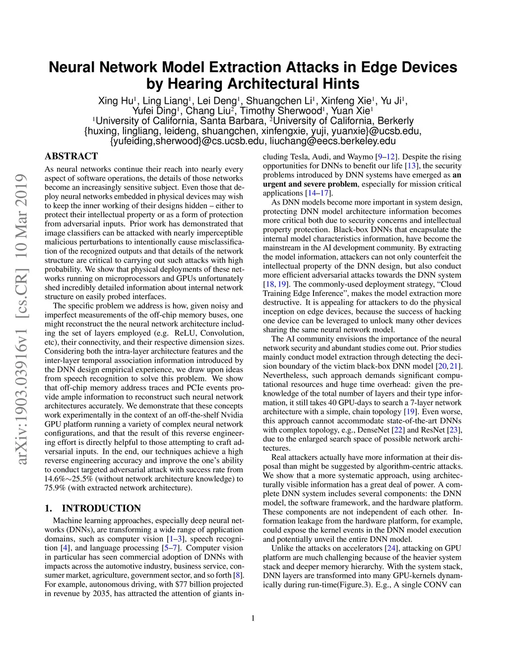 As neural networks continue their reach into nearly every aspect of software operations, the details of those networks become an increasingly sensitive subject. Even those that deploy neural networks embedded in physical devices may wish to keep the inner working of their designs hidden -- either to protect their intellectual property or as a form of protection from adversarial inputs. The specific problem we address is how, through heavy system stack, given noisy and imperfect memory traces, one might reconstruct the neural network architecture including the set of layers employed, their connectivity, and their respective dimension sizes. Considering both the intra-layer architecture features and the inter-layer temporal association information introduced by the DNN design empirical experience, we draw upon ideas from speech recognition to solve this problem. We show that off-chip memory address traces and PCIe events provide ample information to reconstruct such neural network architectures accurately. We are the first to propose such accurate model extraction techniques and demonstrate an end-to-end attack experimentally in the context of an off-the-shelf Nvidia GPU platform with full system stack. Results show that the proposed techniques achieve a high reverse engineering accuracy and improve the one's ability to conduct targeted adversarial attack with success rate from 14.6\%25.5\% (without network architecture knowledge) to 75.9\% (with extracted network architecture).