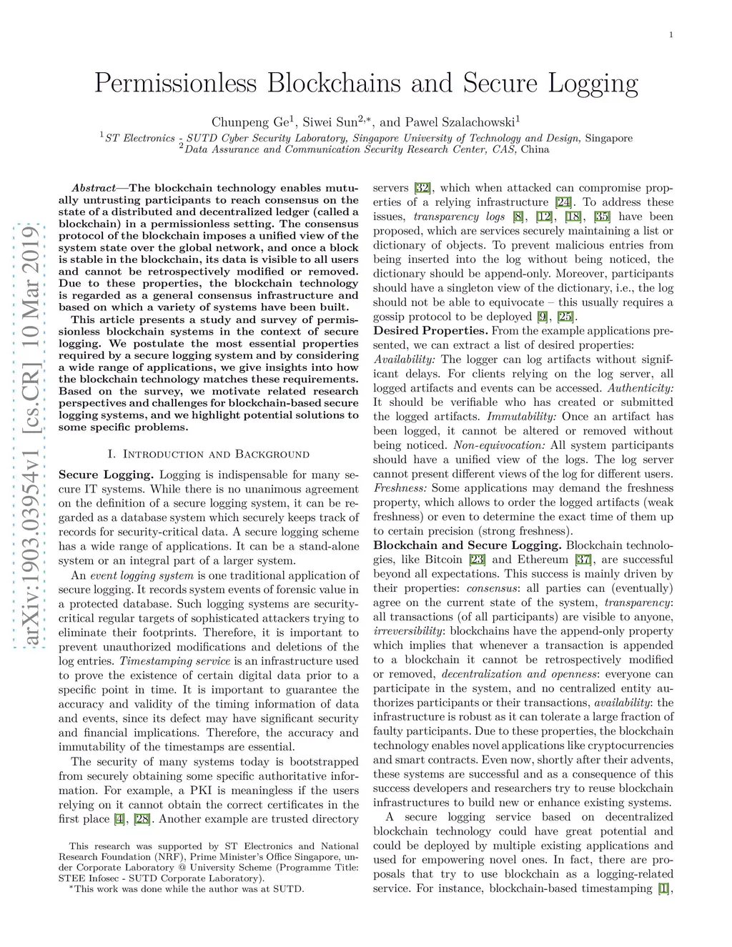The blockchain technology enables mutually untrusting participants to reach consensus on the state of a distributed and decentralized ledger (called a blockchain) in a permissionless setting. The consensus protocol of the blockchain imposes a unified view of the system state over the global network, and once a block is stable in the blockchain, its data is visible to all users and cannot be retrospectively modified or removed. Due to these properties, the blockchain technology is regarded as a general consensus infrastructure and based on which a variety of systems have been built. This article presents a study and survey of permissionless blockchain systems in the context of secure logging. We postulate the most essential properties required by a secure logging system and by considering a wide range of applications, we give insights into how the blockchain technology matches these requirements. Based on the survey, we motivate related research perspectives and challenges for blockchain-based secure logging systems, and we highlight potential solutions to some specific problems.